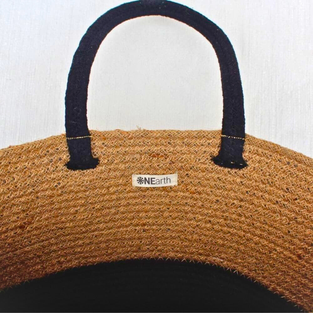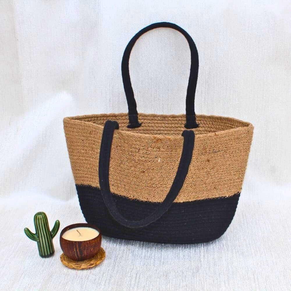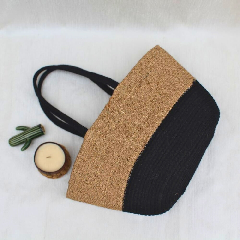 A two-tone black and beige jute tote that blends everyday practicality with a bold, graphic look. Handwoven and structured, it’s roomy enough for daily essentials while adding a striking, earthy accent to any outfit.