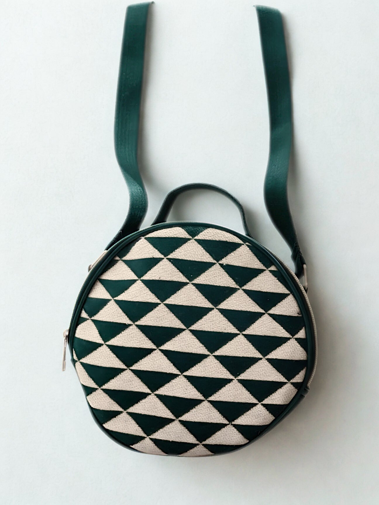 A round vegan leather and jute sling bag in black and grey, featuring a triangle jute design on the front. Compact yet roomy enough for essentials, it’s a perfect sling for brunches, travel, or evenings out.