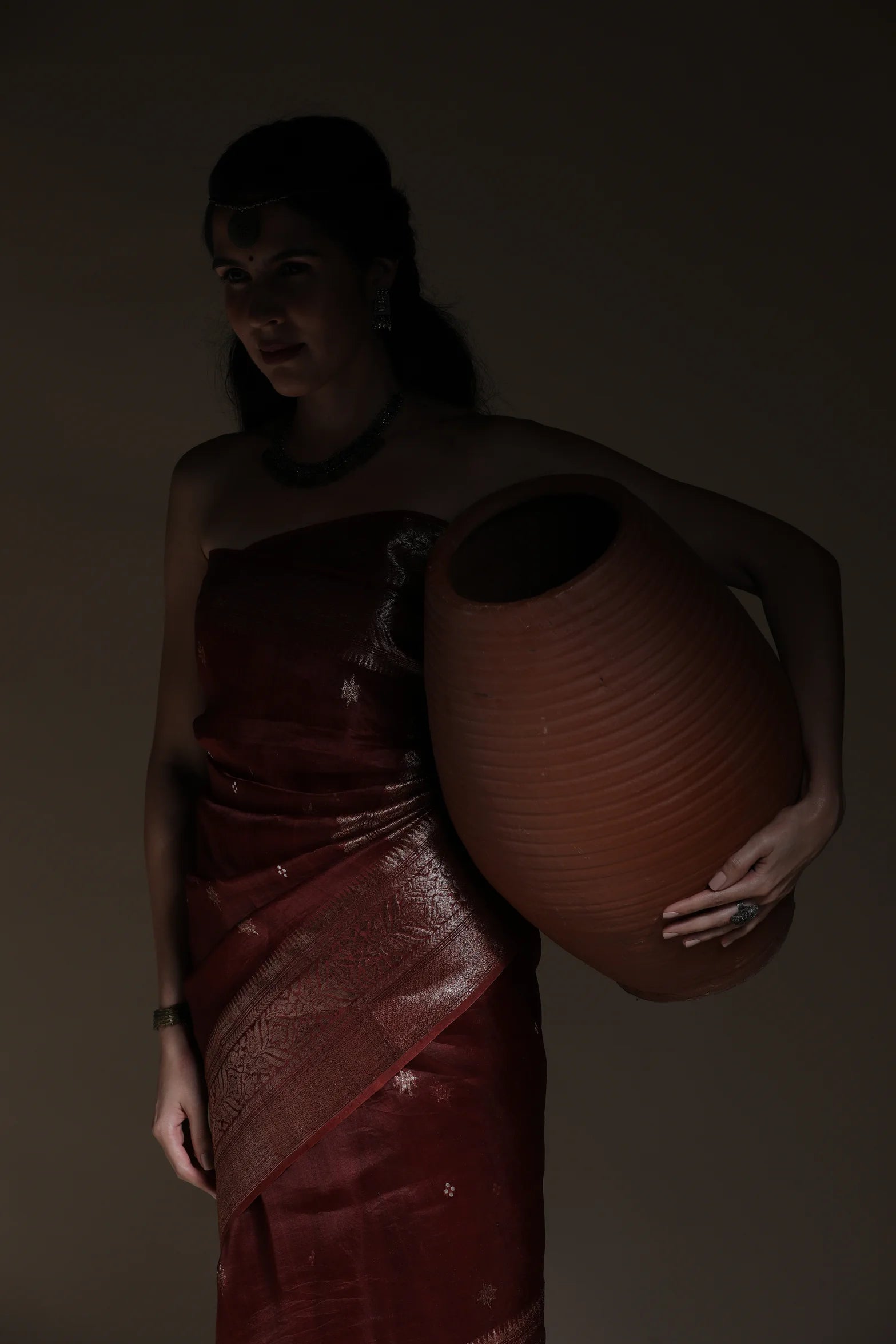 Subtle yet striking, this maroon organza Banarasi silk saree features delicate star motifs that glint with golden artistry. The sheer texture of organza paired with Banarasi zari work creates a balance of tradition and contemporary allure. Perfect for intimate celebrations, it’s a saree that whispers luxury in every thread.