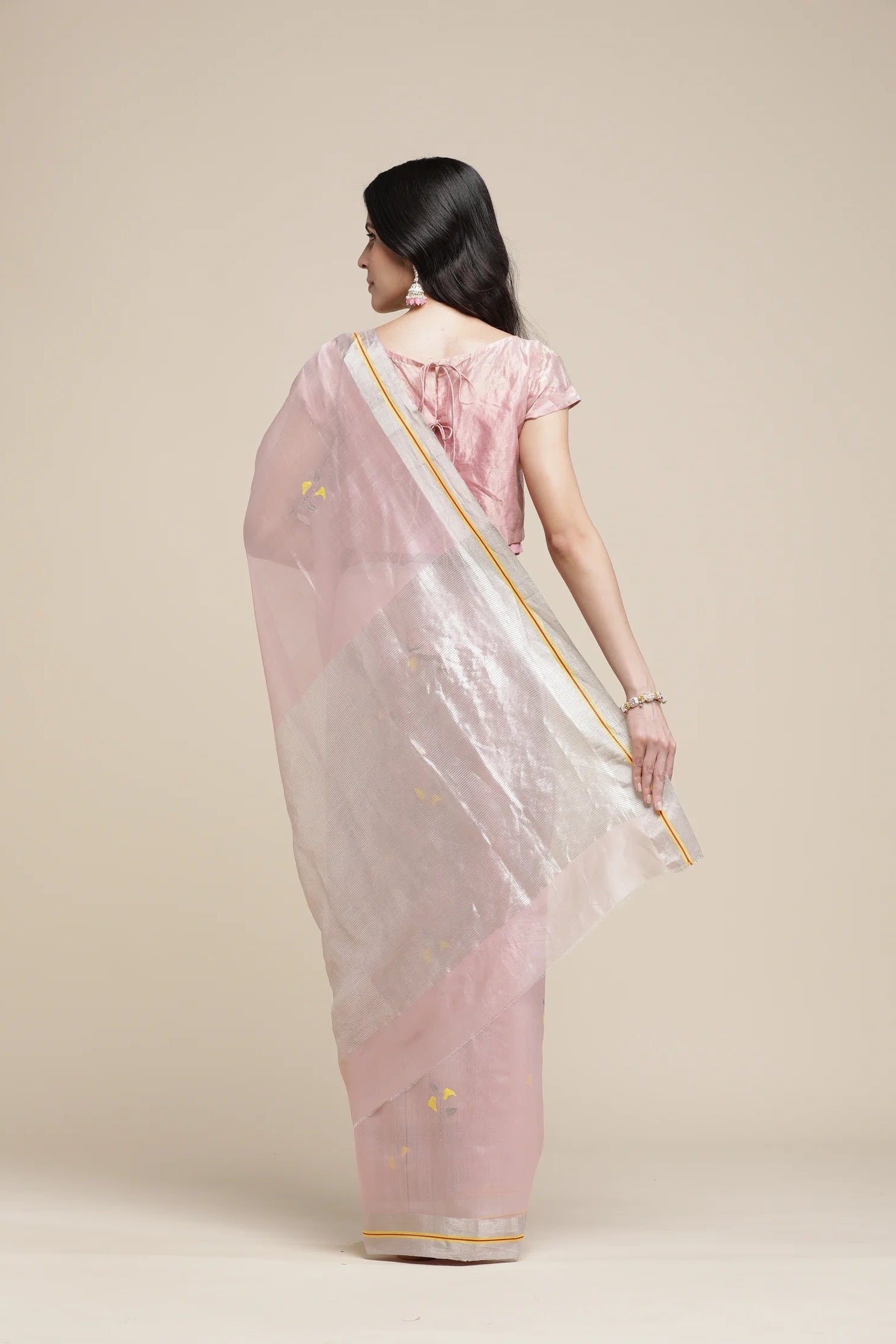 Soft, feminine, and timeless, this pastel peach Chanderi handloom saree with small flower butti is pure charm. The gentle sheen of silk and the airiness of cotton make it perfect for long celebrations and quiet evenings alike. It’s a weave that celebrates emotion, tender, honest, and handmade.