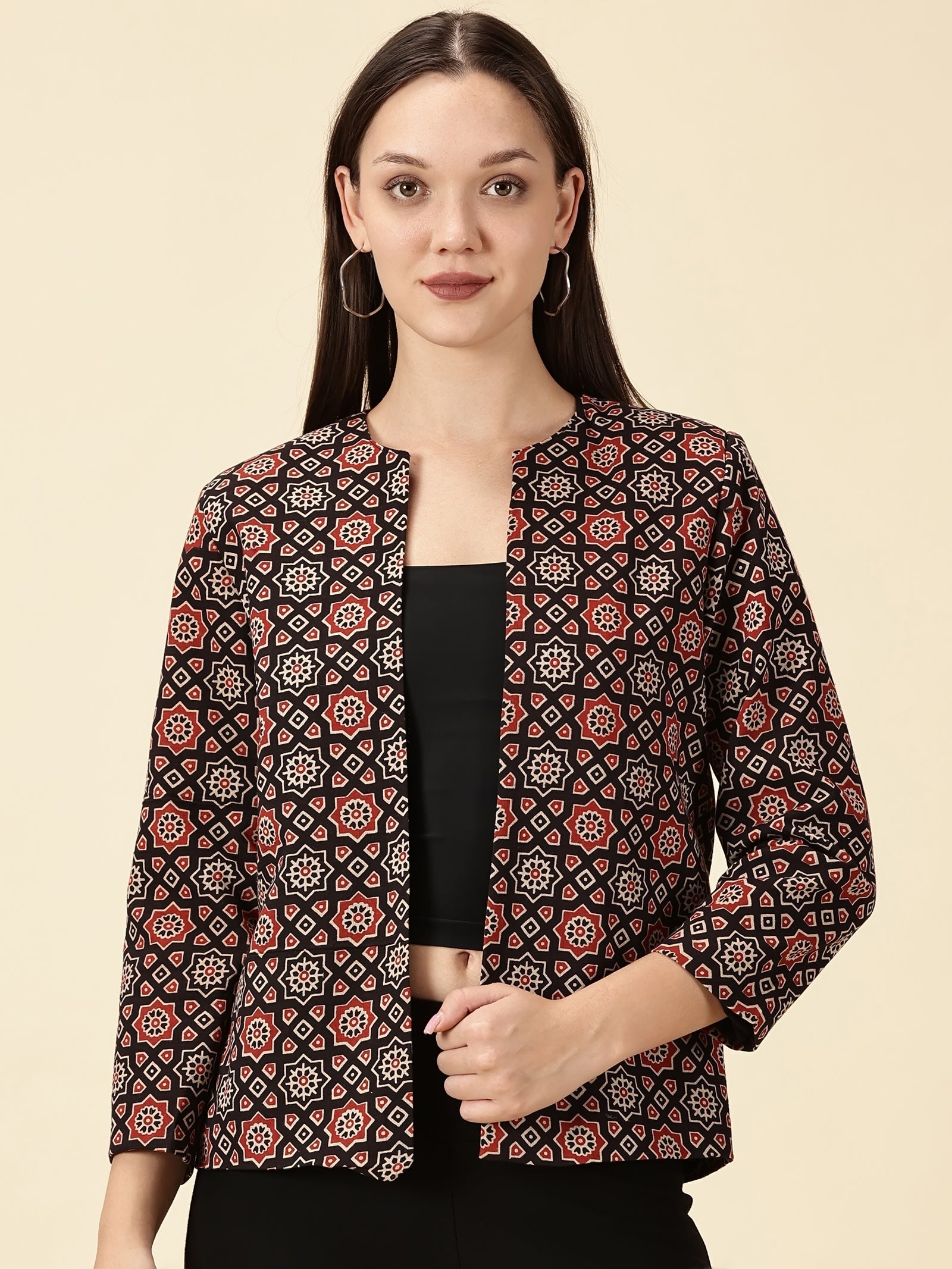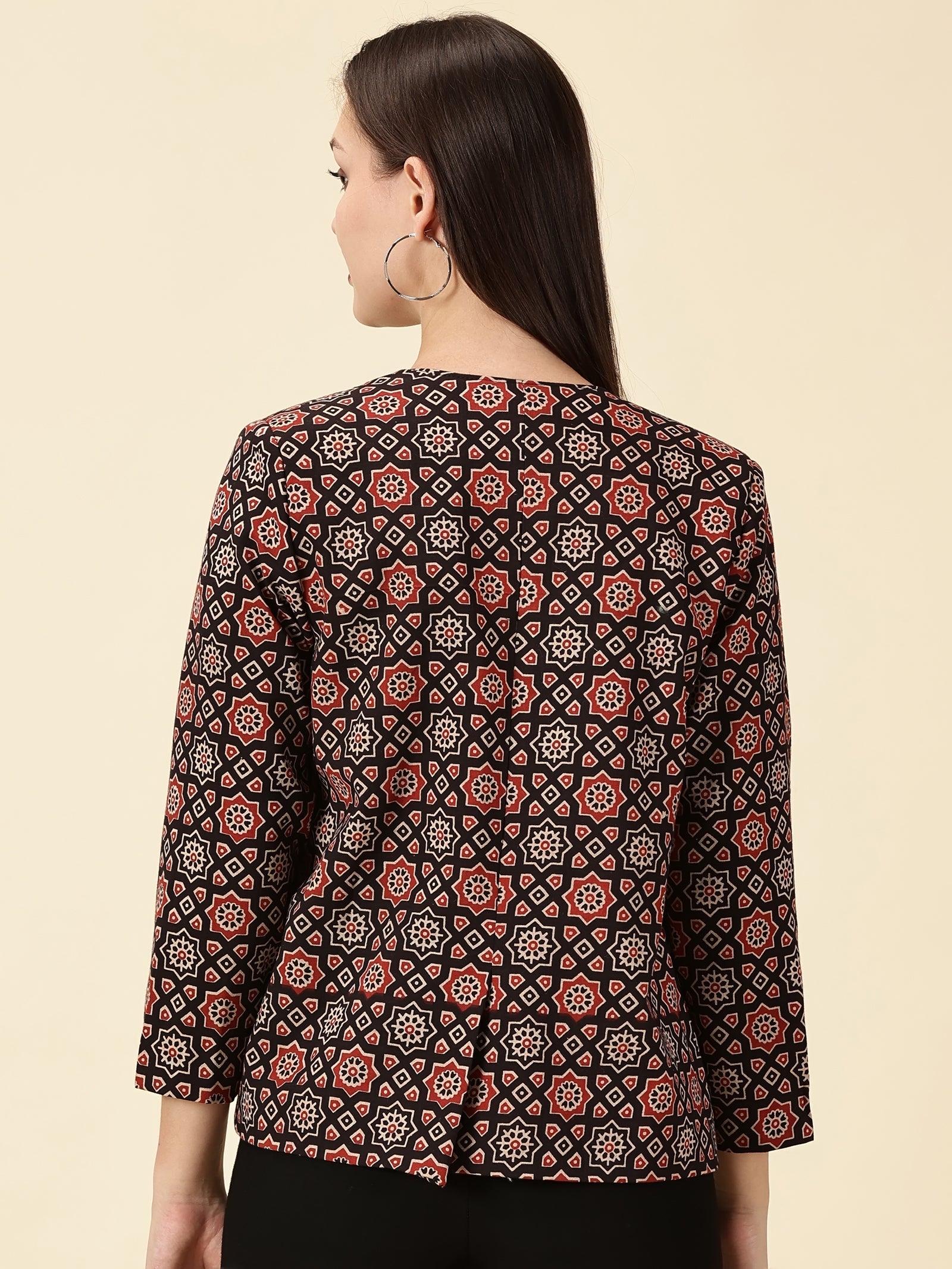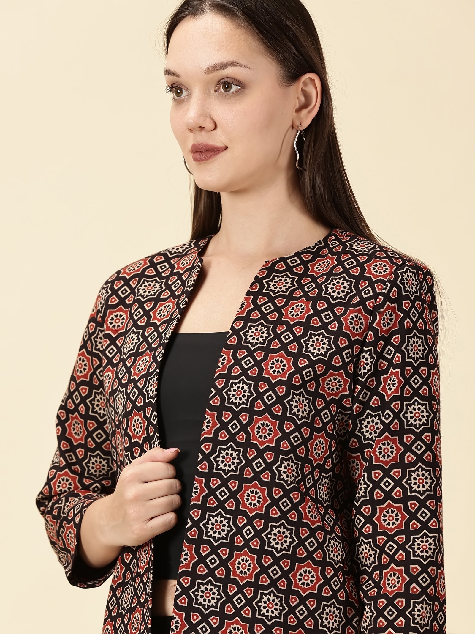 • An Ajrak story, reimagined for today. This open-front blazer brings together handblock heritage and modern tailoring, giving you a piece that moves seamlessly between work, celebrations, and slow Sunday evenings. The pure cotton fabric sits lightly on the body, while the clean silhouette layers effortlessly over kurtas, trousers, or denim. Every motif holds the rhythm of Ajrak artisanship. Timeless, bold, and rooted. When you wear it, you don’t just add a statement layer. You carry a craft forward.