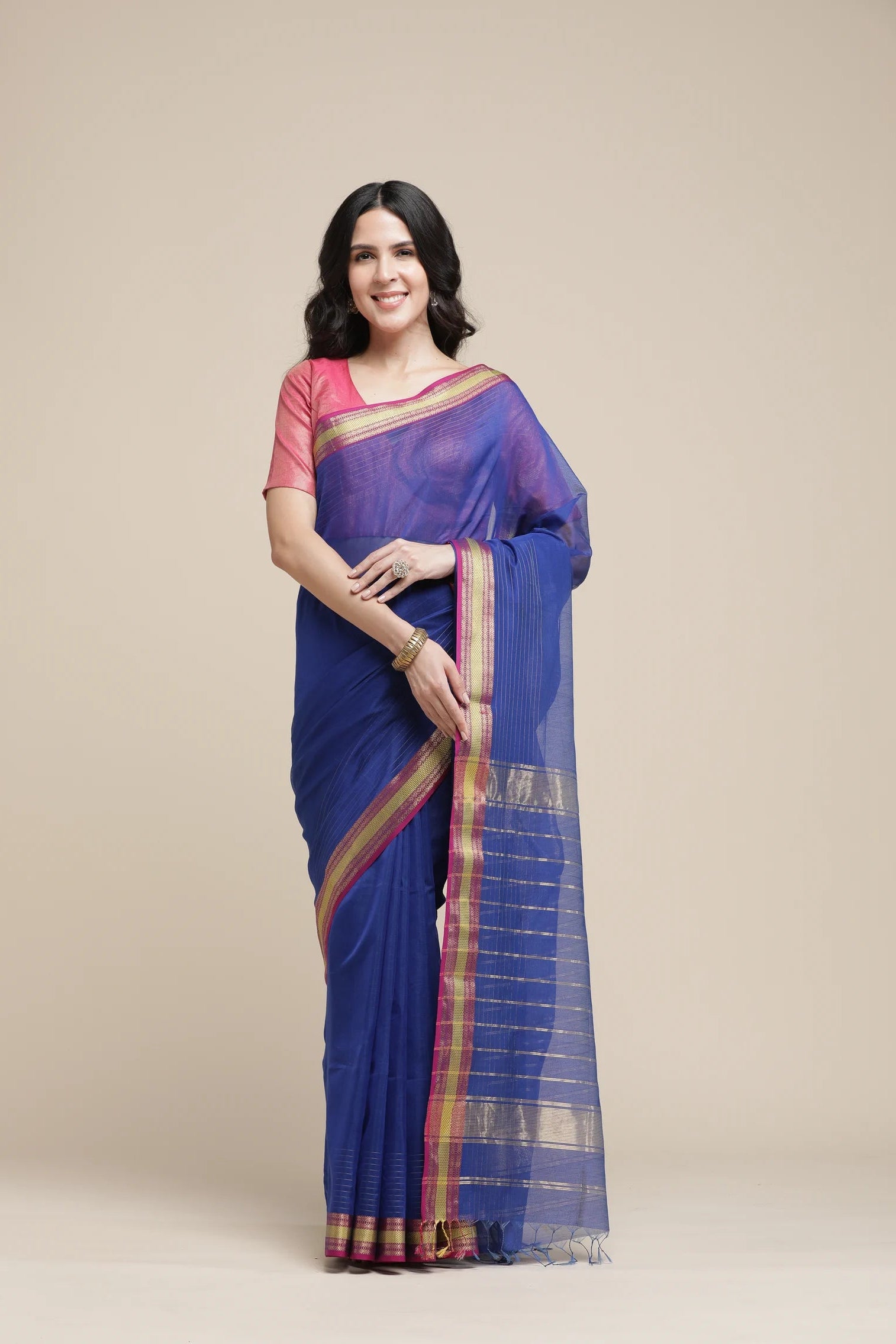 There’s something eternal about the hue of midnight, deep, calm, and endlessly alluring. “Midnight Whisper” captures that quiet allure in soft silk-cotton Maheshwari weave, where fine golden zari borders meet a deep blue body. Lightweight yet rich in texture, this saree drapes like poetry, understated but impossible to ignore. Perfect for twilight gatherings, candle-lit dinners, or when you simply wish to feel radiant in stillness.