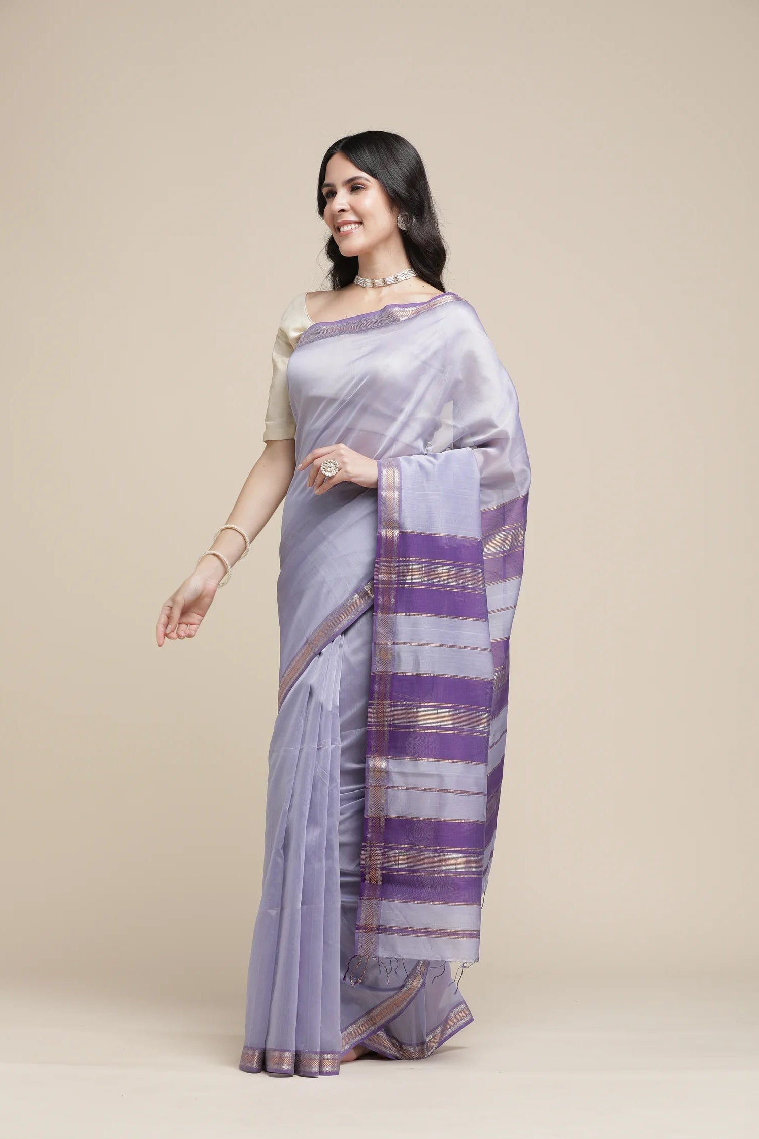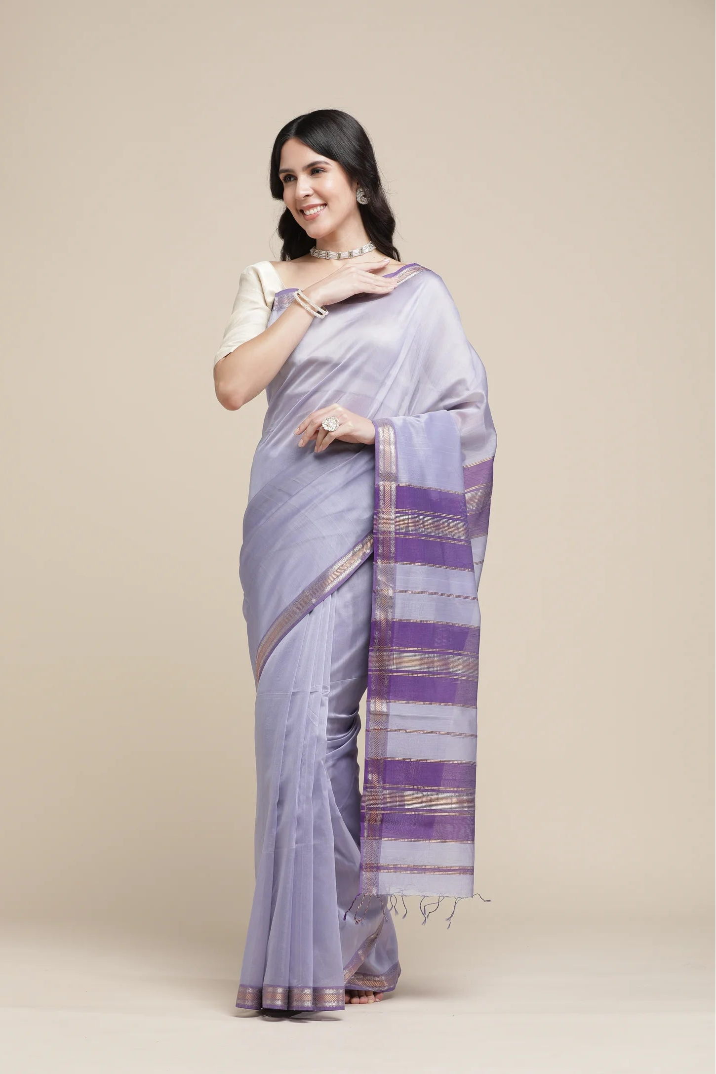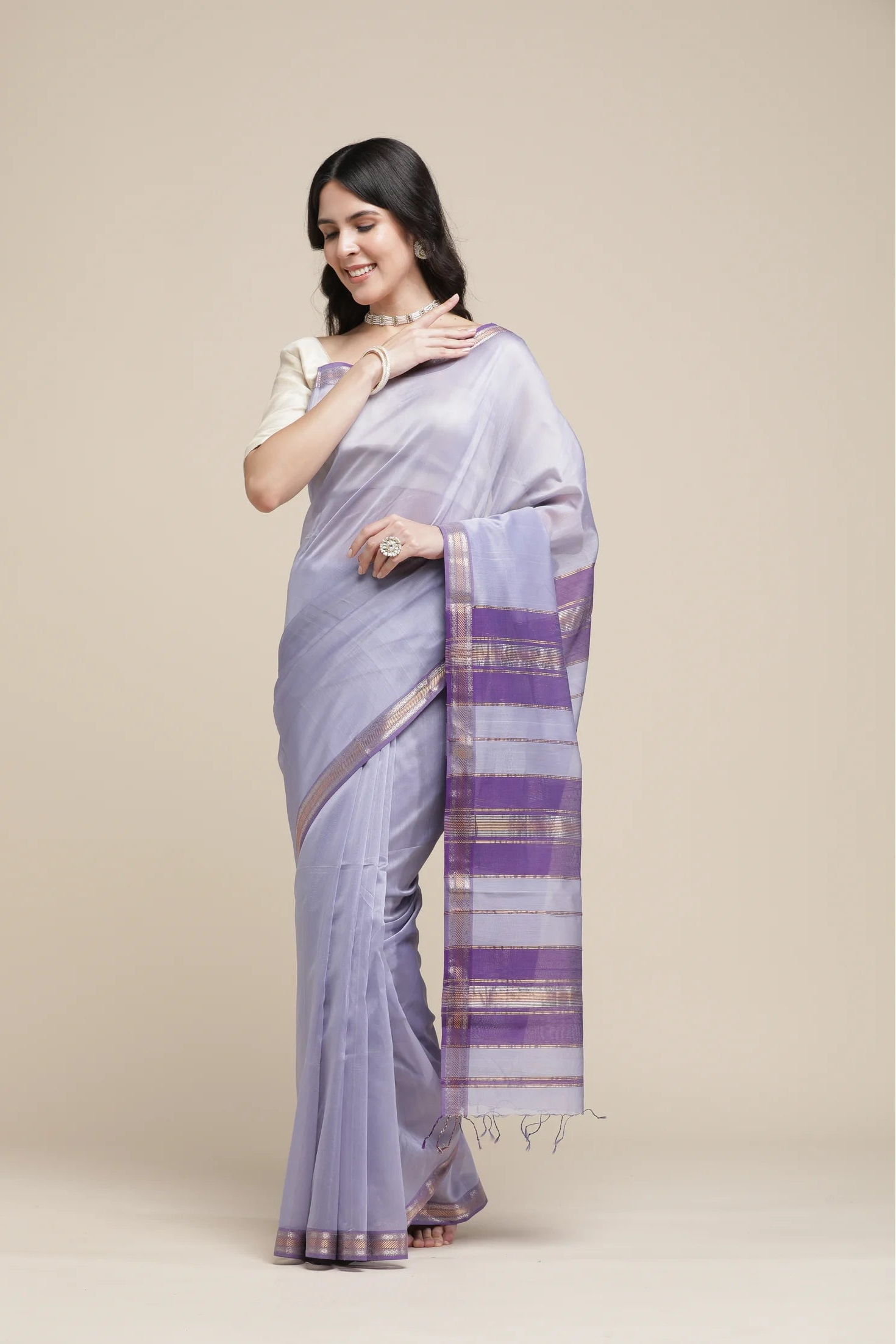 The serenity of purple meets the luminous edge of gold in this Maheshwari cotton silk saree. Accented with golden zari borders, it’s an ode to contrast, earth meeting the horizon, heritage meeting modernity. Handwoven with patience and pride, this saree is perfect for those who see beauty in craftsmanship and quiet