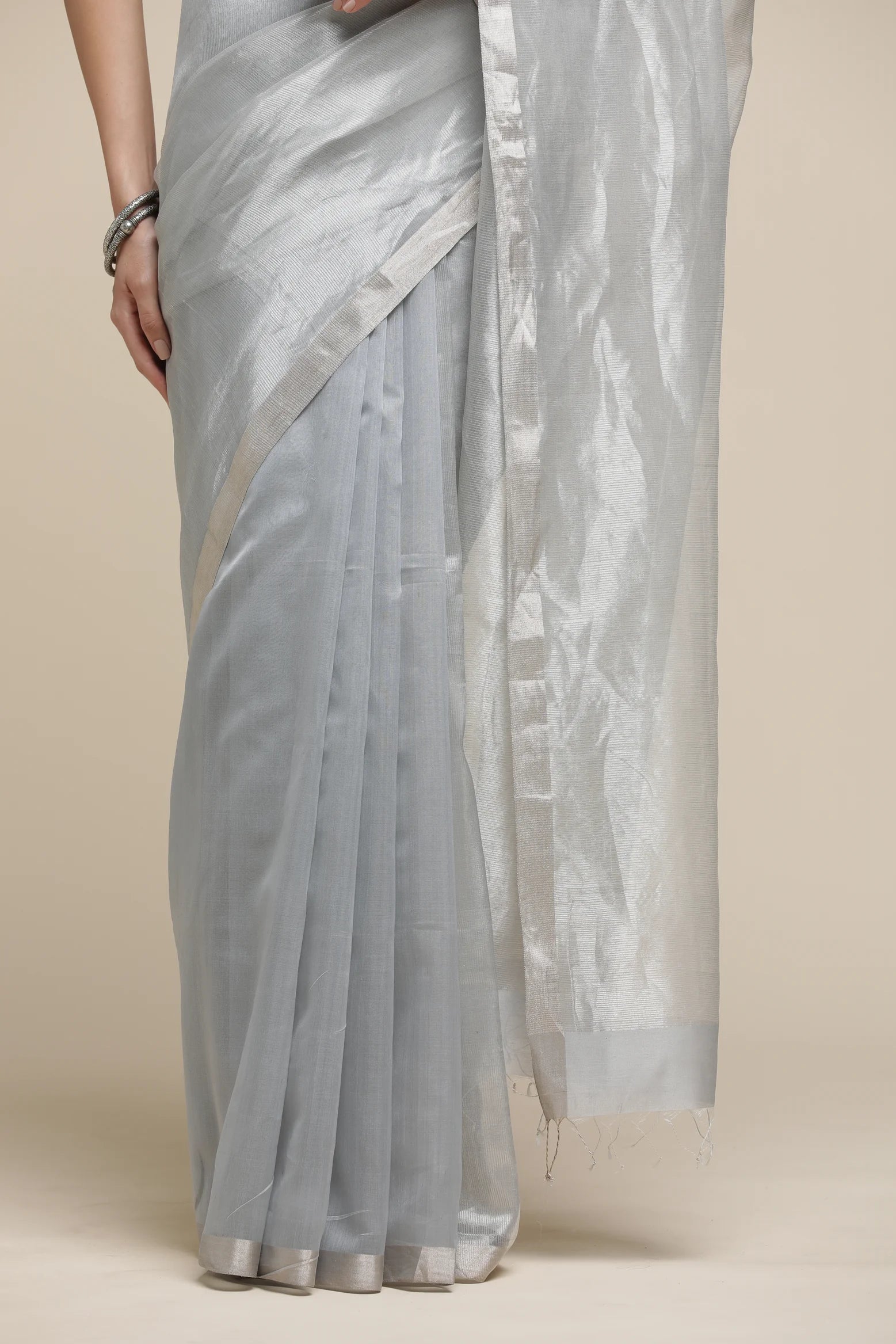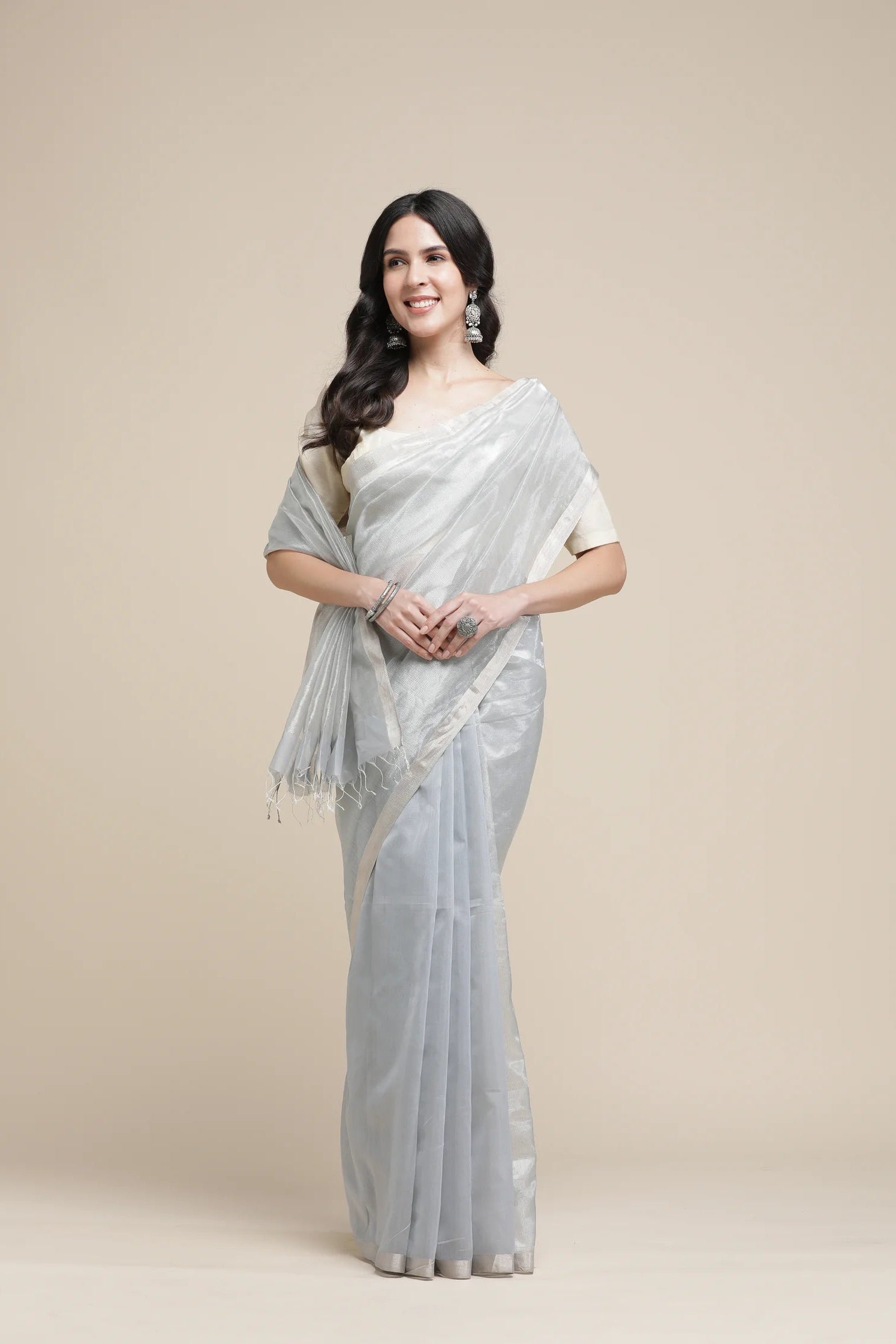 Refined and regal, this Maheshwari silk cotton saree in pastel blue whispers of quiet sophistication. The silver zari pinstripes lend it a rhythmic symmetry, like poetry on fabric. Handwoven by artisans in Maheshwar, it carries the essence of the river Narmada’s calm flow and the palace looms’ timeless rhythm. A heritage piece, elegant for day-to-evening wear.