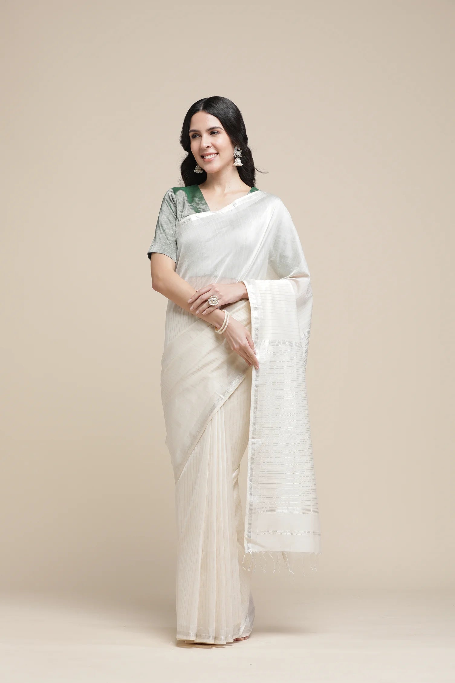 A masterpiece of geometry and grace, this Maheshwari cotton silk saree in pristine white features zari chatai geha stripes, a symbol of precision and patience. Lightweight yet regal, it bridges tradition and minimalism with quiet brilliance. A piece that defines heritage luxury in its most subtle form.