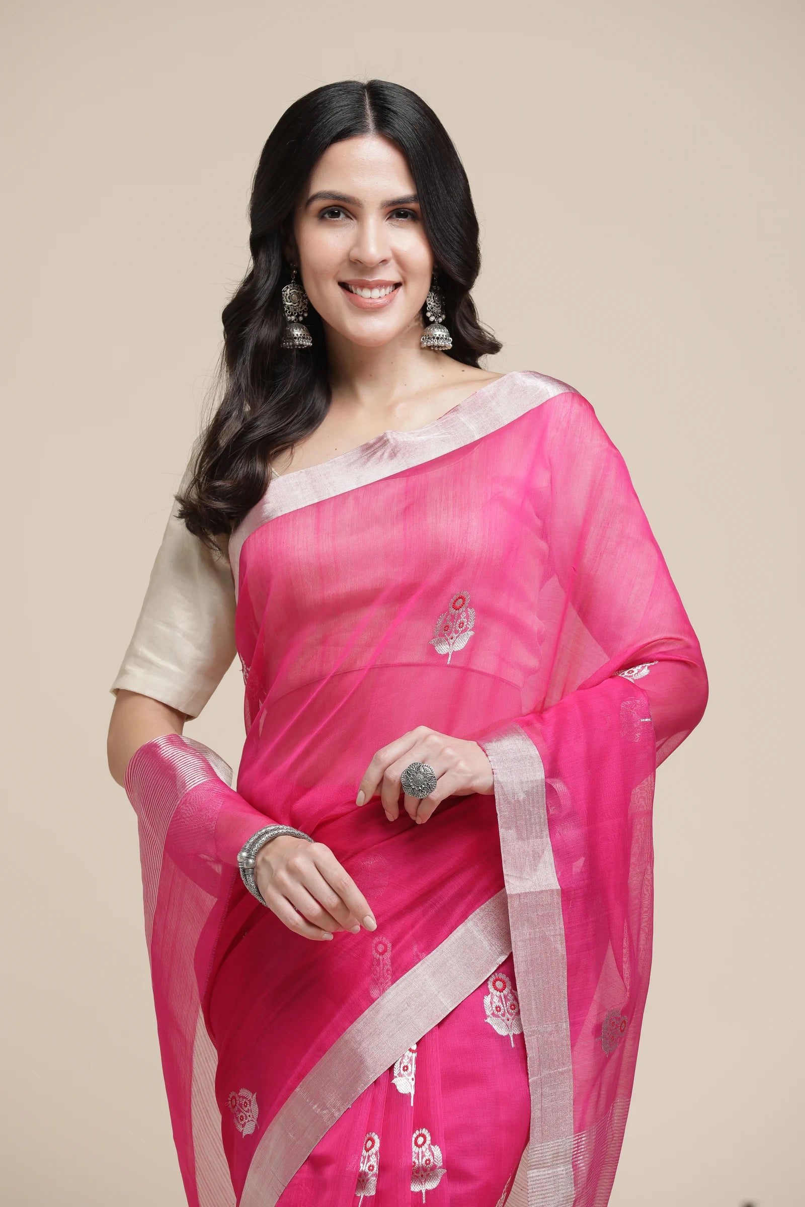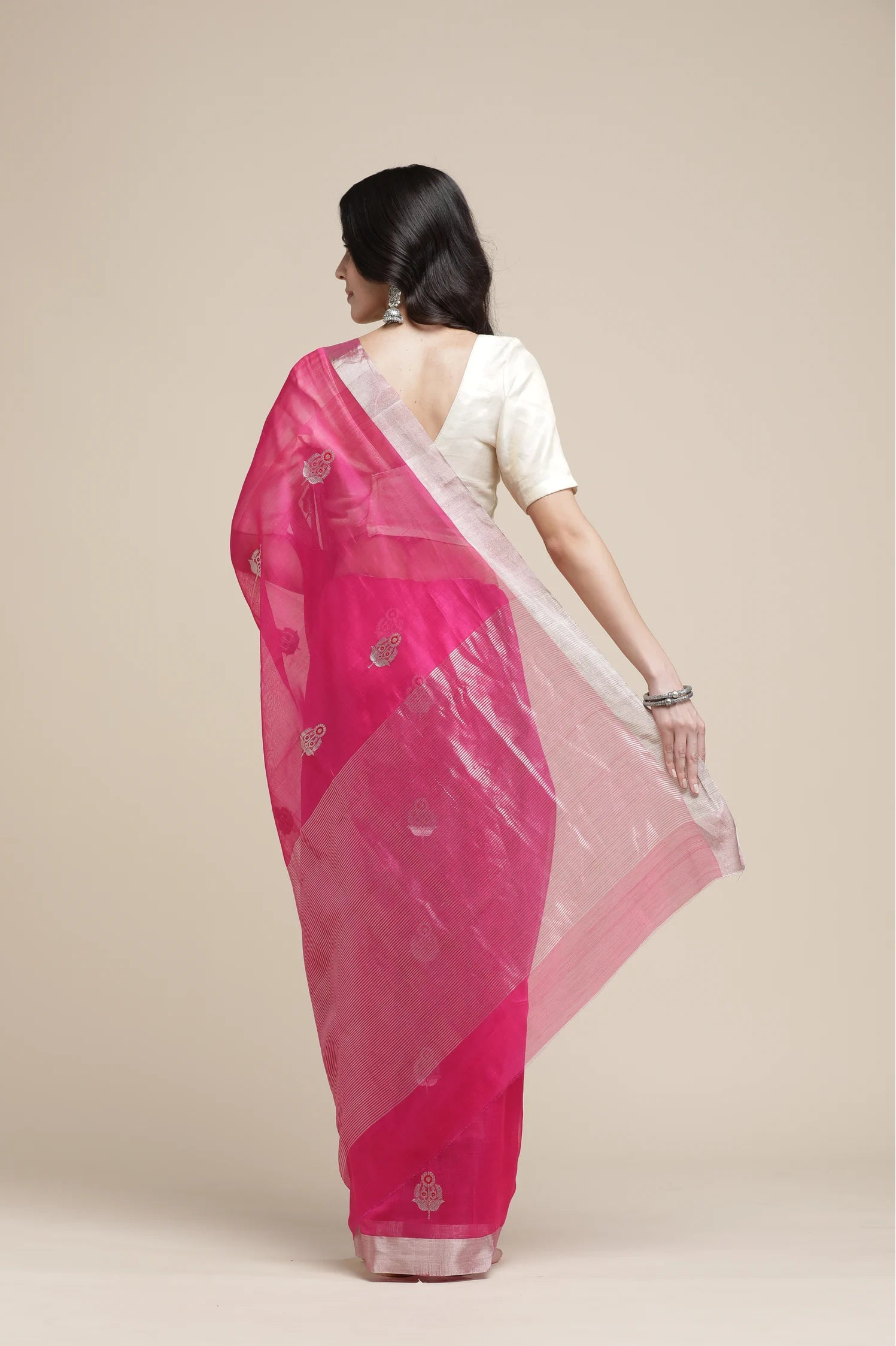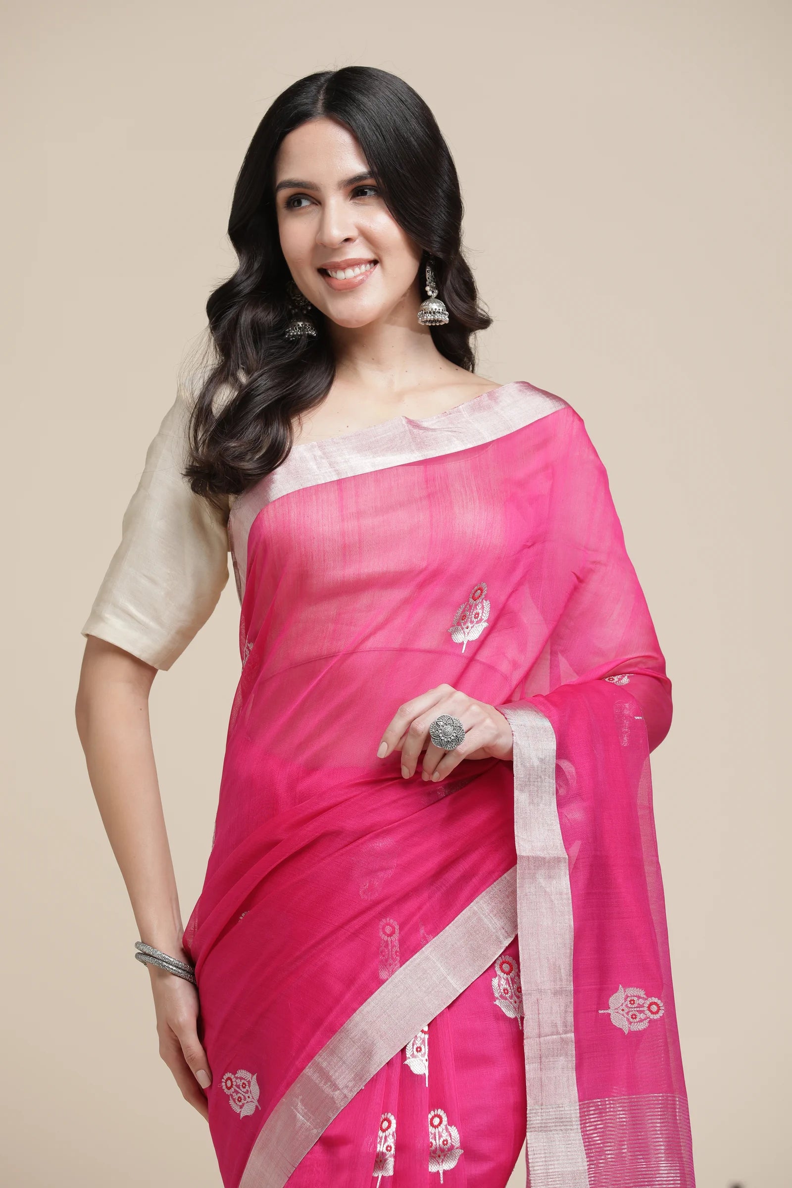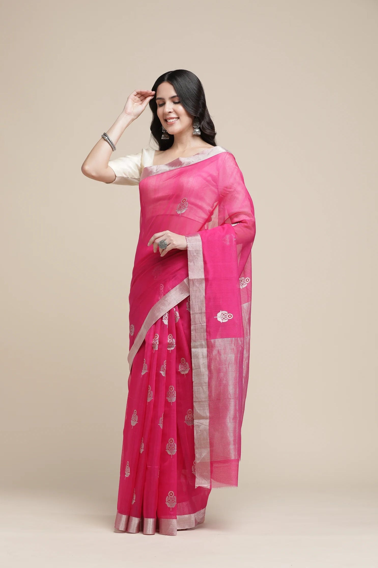 A radiant celebration in pink, this Chanderi handloom cotton saree brings to life the warmth of festive mornings and temple bells. Its long zari butti glimmers like captured sunlight, lending every drape an ethereal charm. Lightweight yet opulent, it flows with the quiet grace of handwoven heritage, crafted by artisans who carry forward centuries of Chanderi weaving traditions. Perfect for the woman who finds strength in softness and elegance in simplicity.