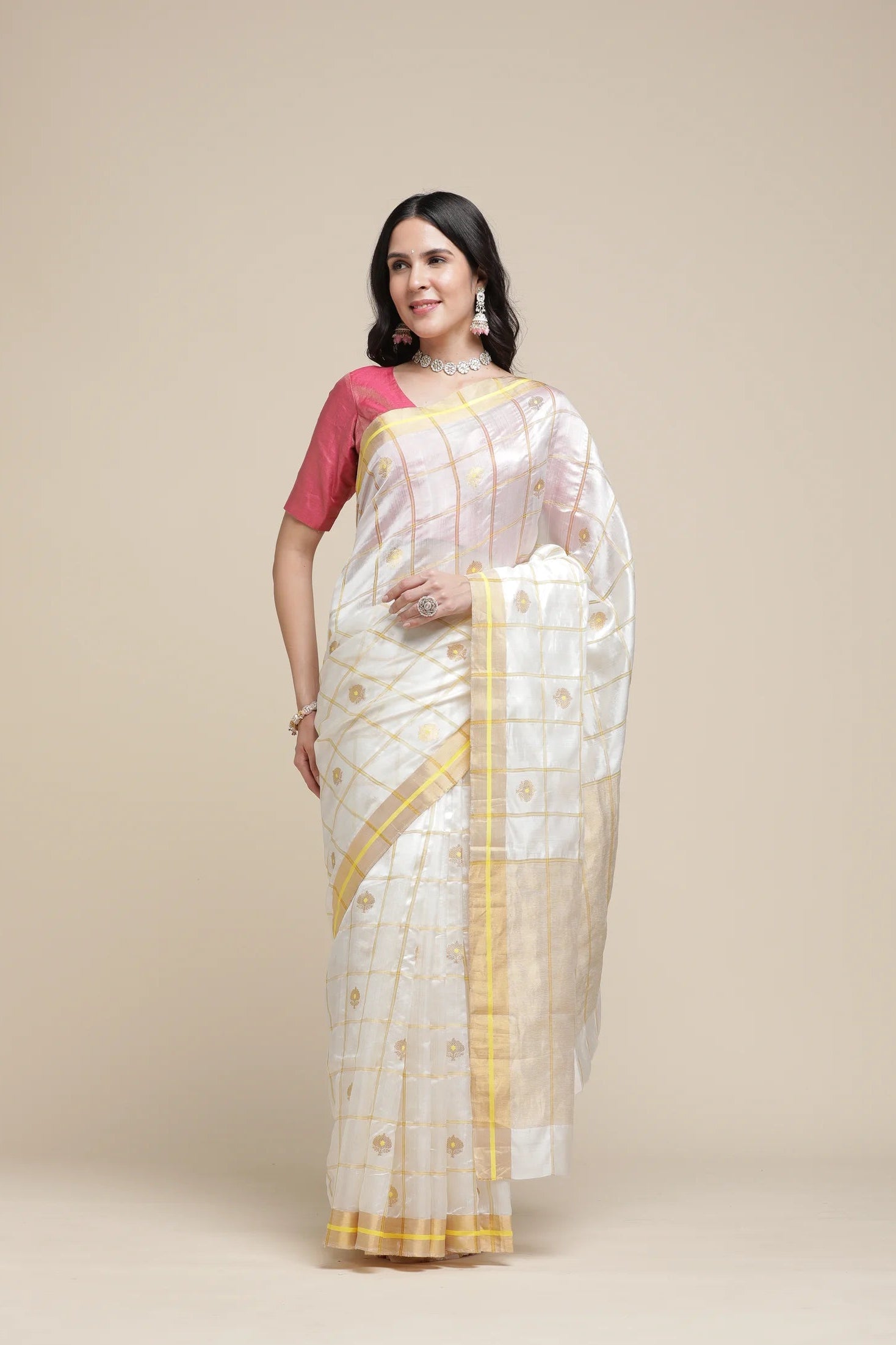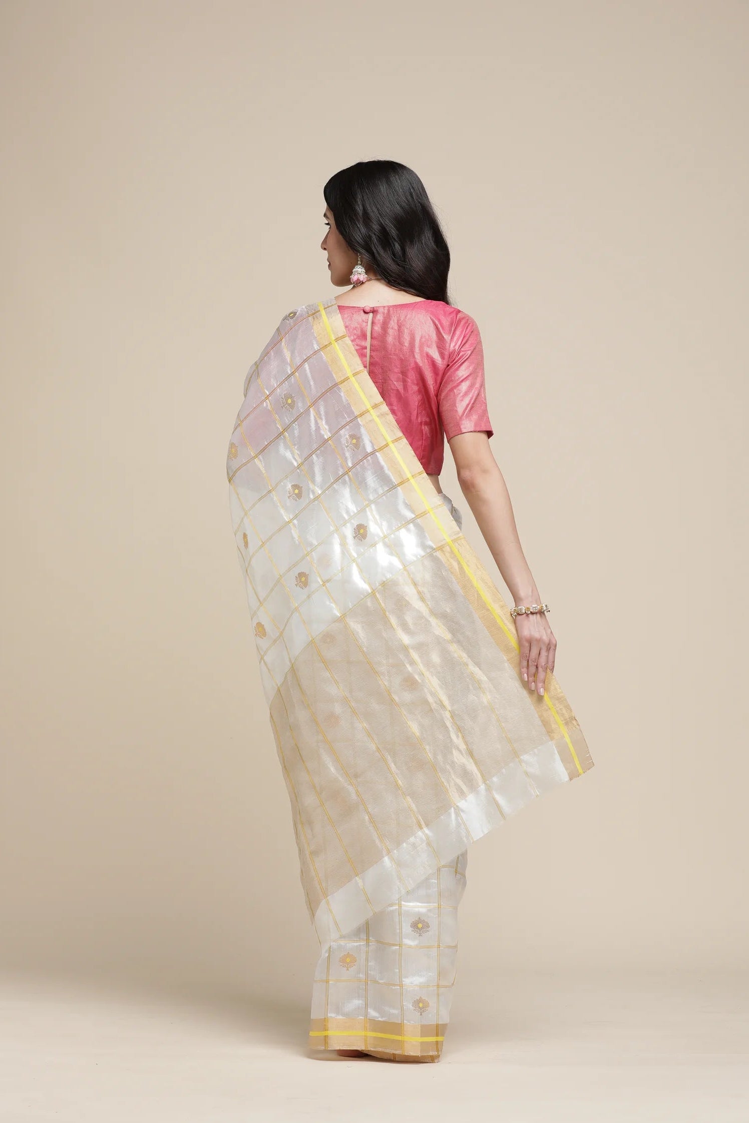 The elegant white pure silk saree reimagines classic design with bold checks and intricate meena leaf motifs. The interplay of pattern and sheen lends it a contemporary touch while remaining rooted in the tradition of handloom weaving. Perfect for festive gatherings, it blends structure and softness, a saree that bridges heritage and modernity.