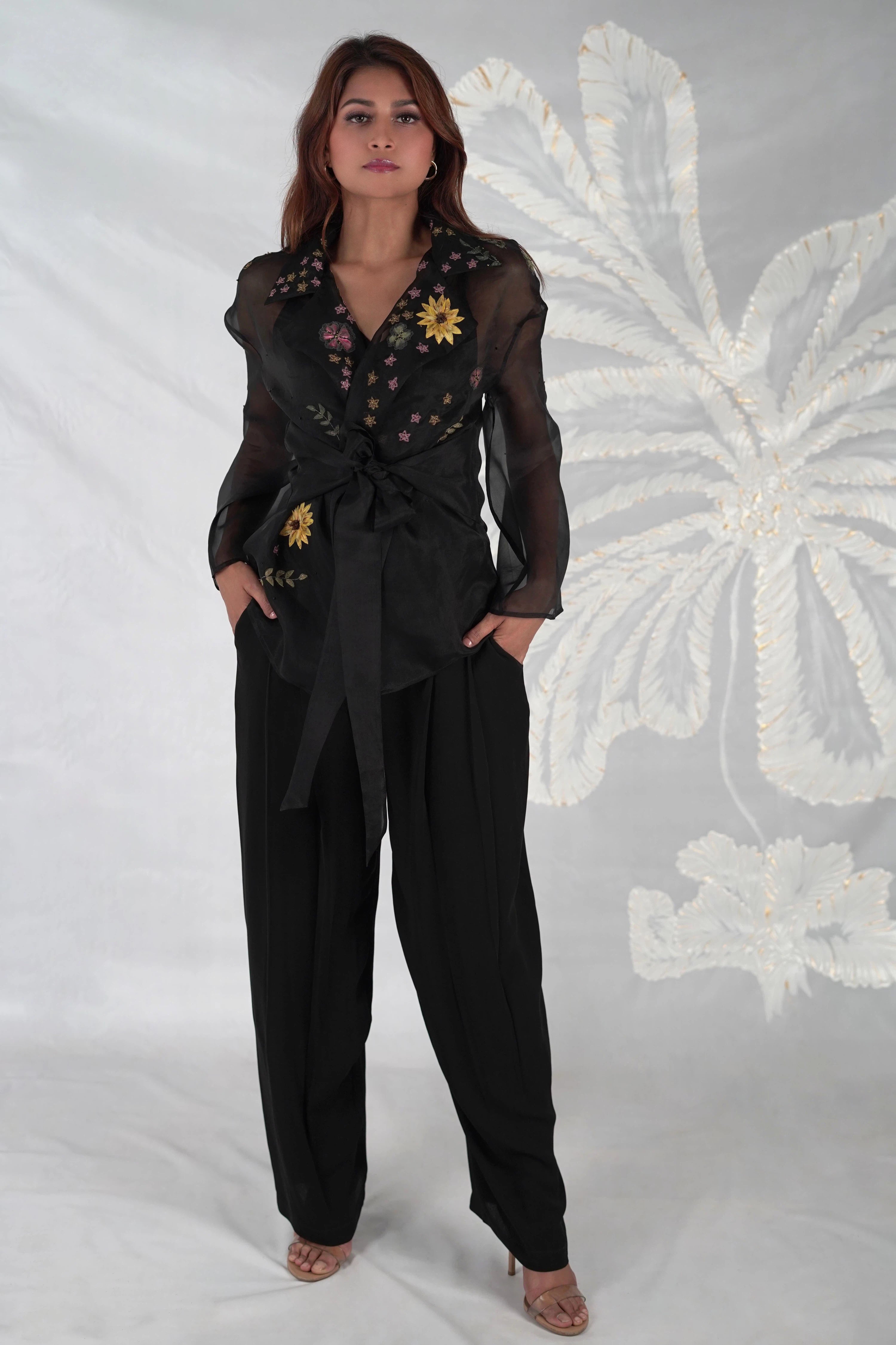 The Alaya Organza Jacket in classic Jet Black is crafted from airy silk organza. Designed with three-quarter sleeves, a notched lapel, and adjustable tie-ups, this jacket combines structure with fluidity.