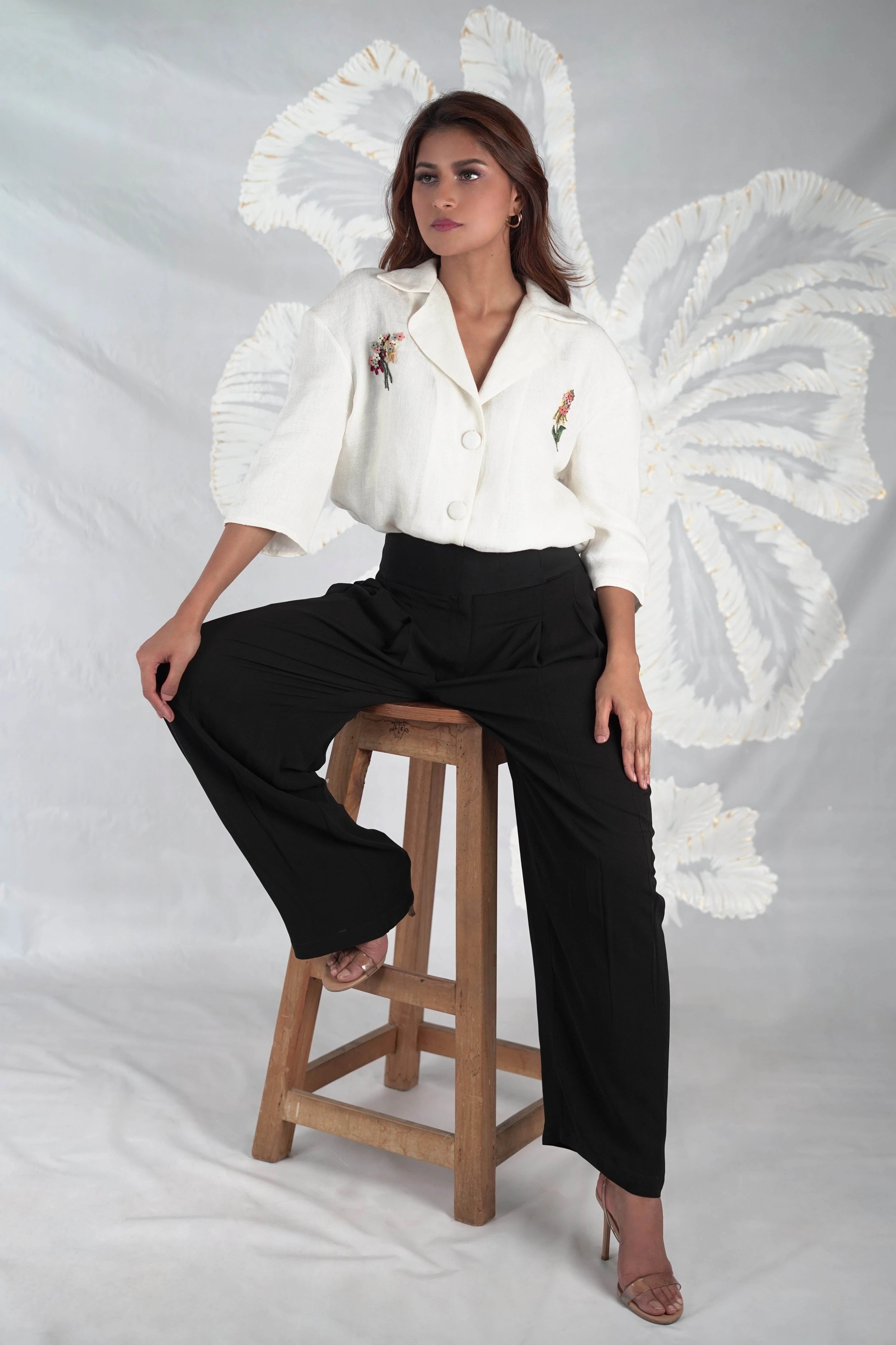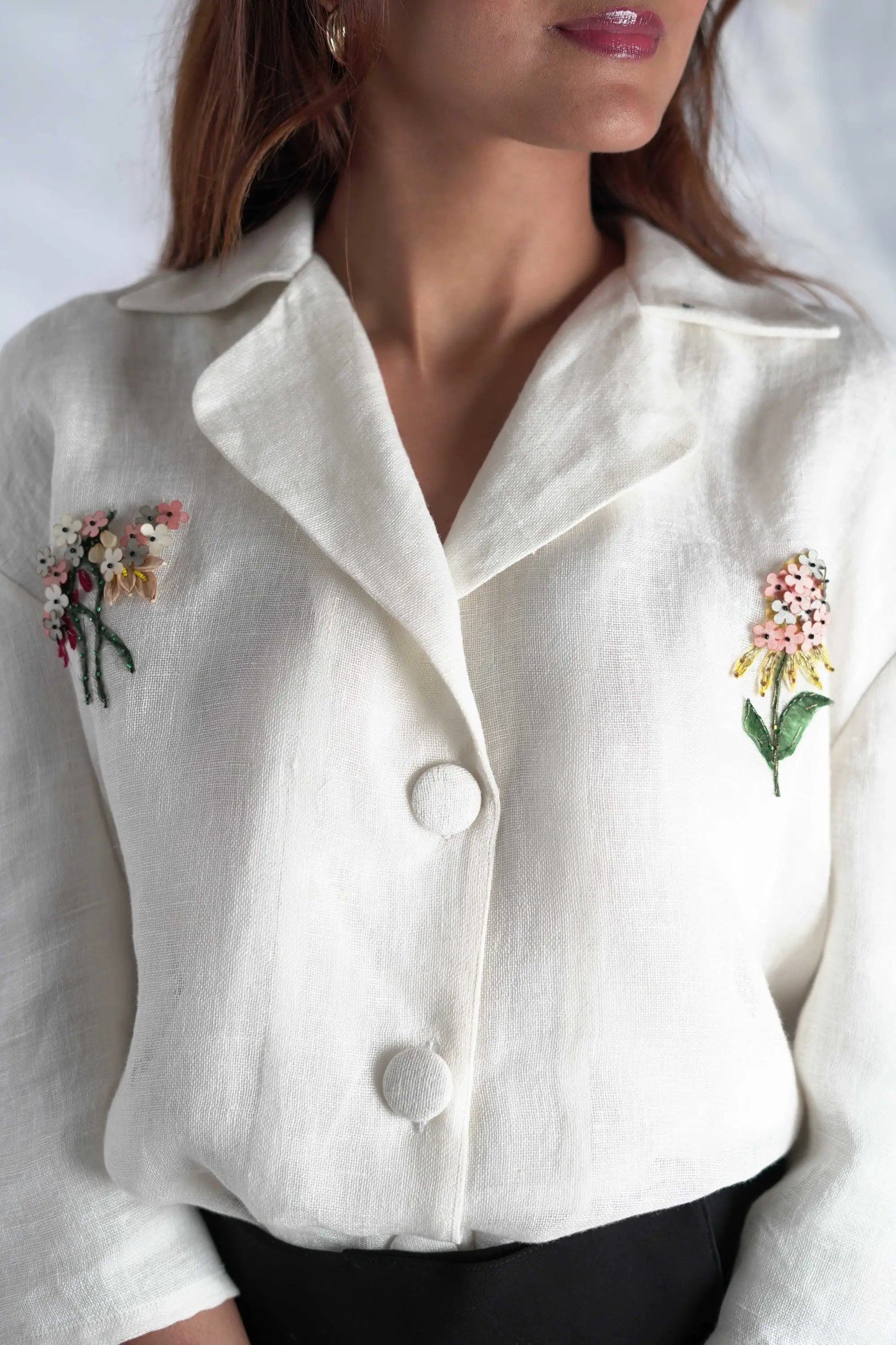 This sophisticated shirt features intricate embroidery, adding a touch of artisanal detail to its clean, white canvas. The notched lapel collar and three-quarter sleeves give it a sharp, yet relaxed silhouette. With a front closure and a relaxed fit, the Evara shirt is designed to be a timeless staple in any wardrobe, easily transitioning from day to night.