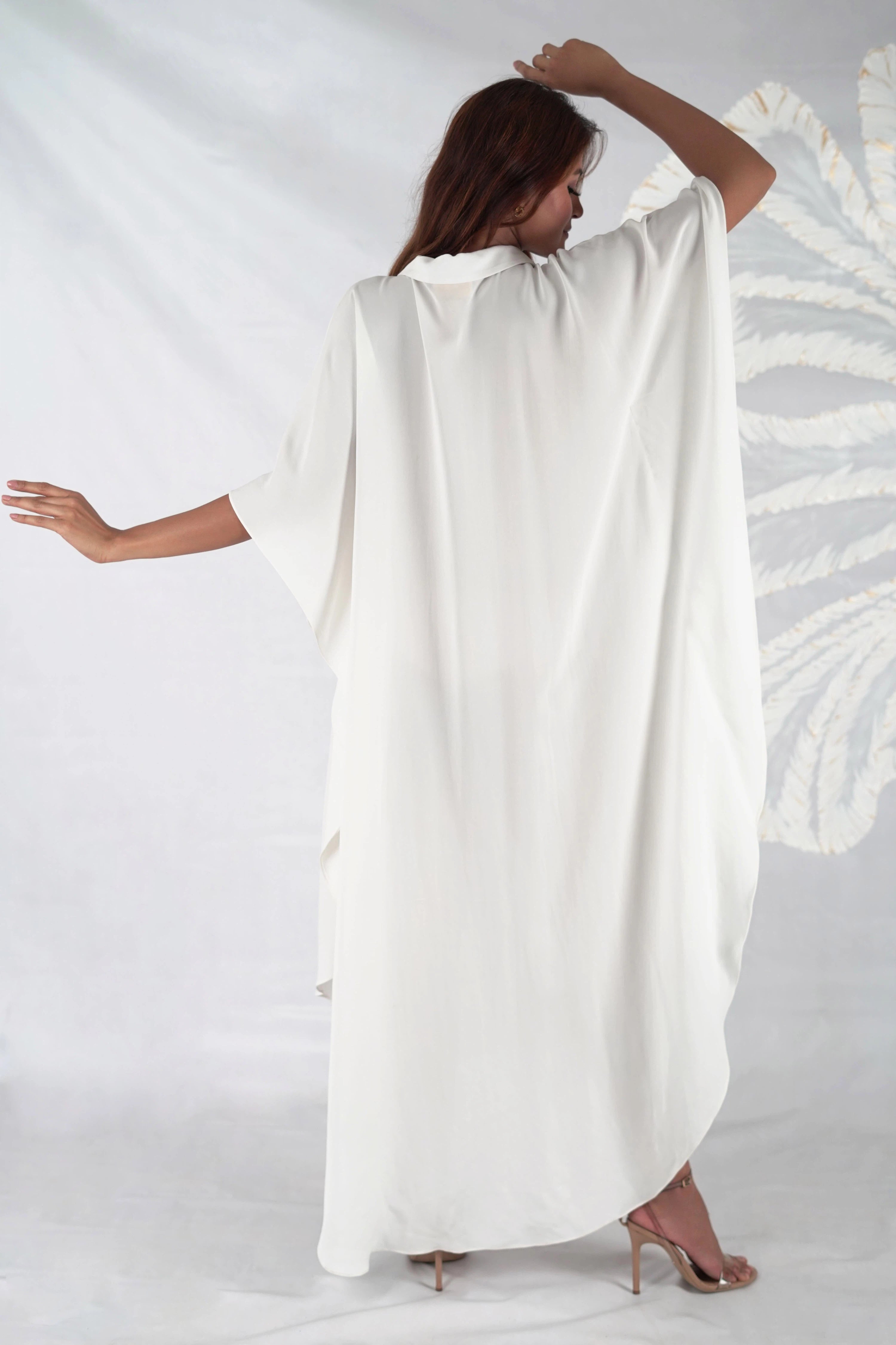 Discover the Ilana White Floral Kaftan, a piece that beautifully blends heritage artistry with effortless comfort. Handcrafted from a luxurious double viscose georgette, this kaftan features a delicate floral pattern that whispers of timeless elegance.