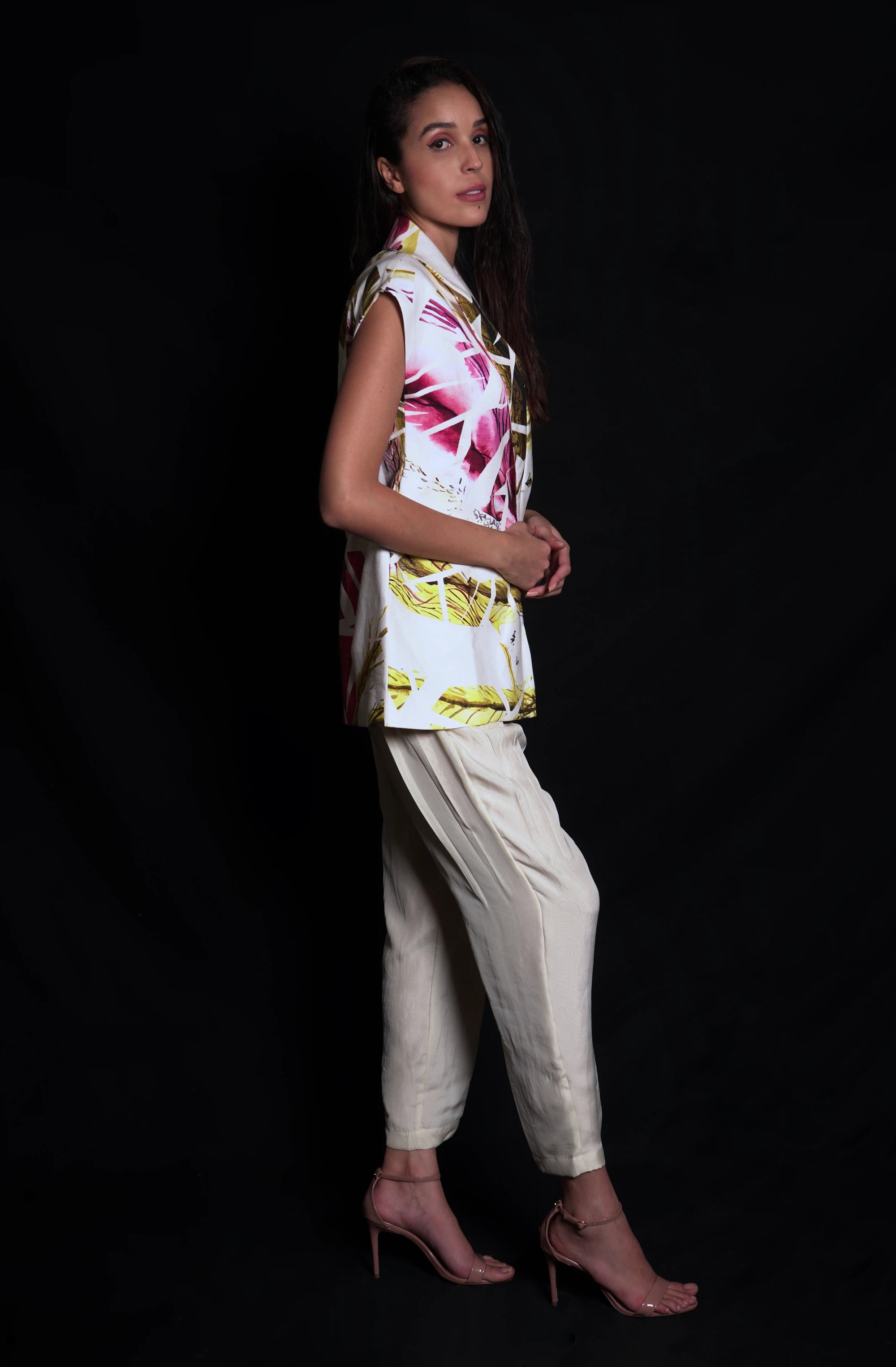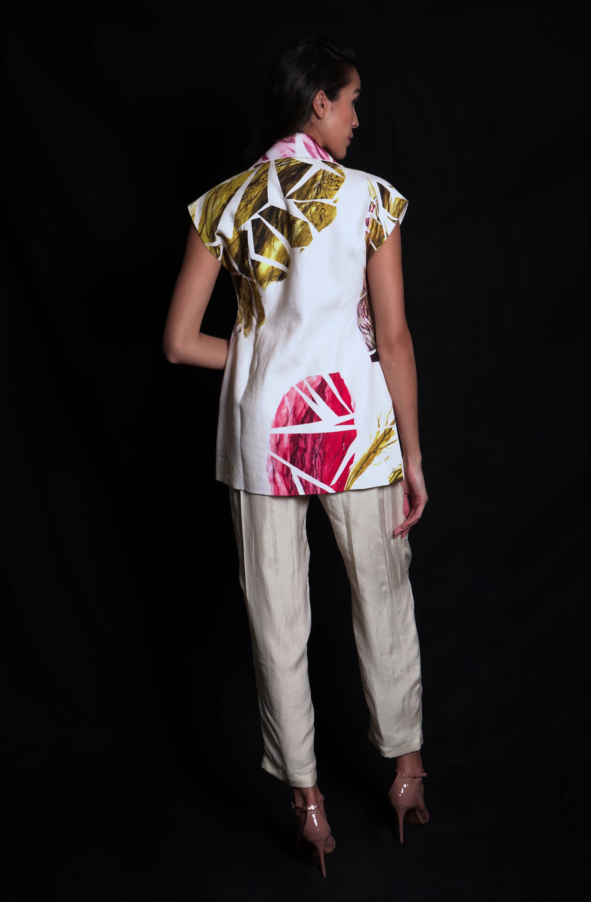 Discover the Marzipan Blazer with Broken Flower Print — where tailored finesse meets artistic expression. Crafted in linen with a habutai lining, this sleeveless blazer carries a striking broken flower print that lends it individuality and depth.