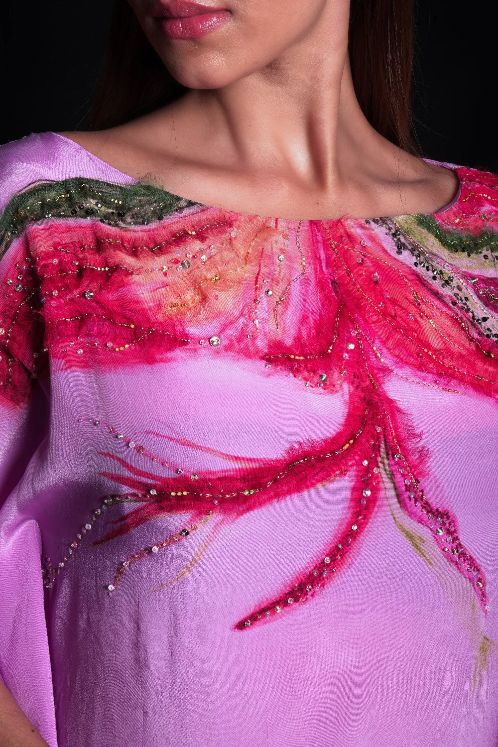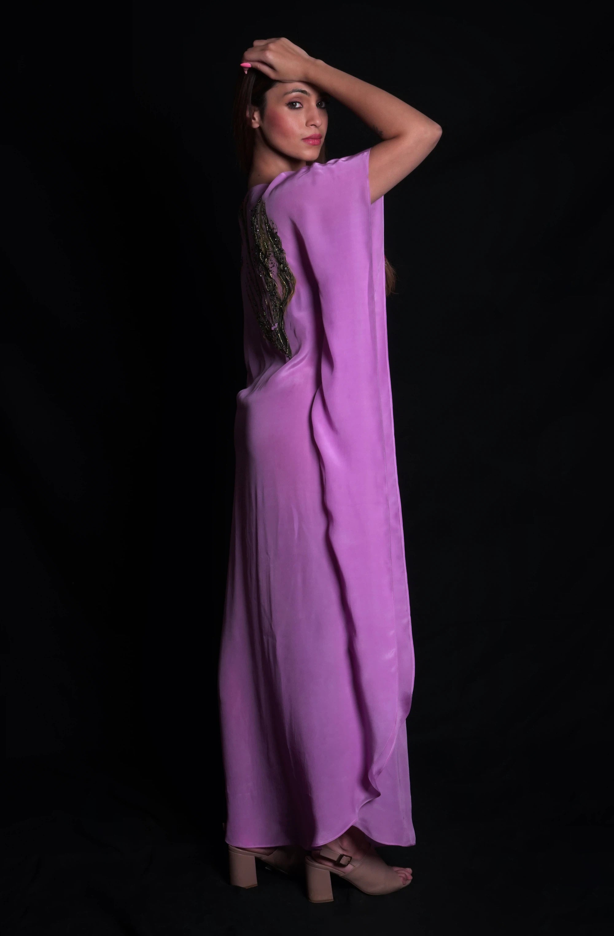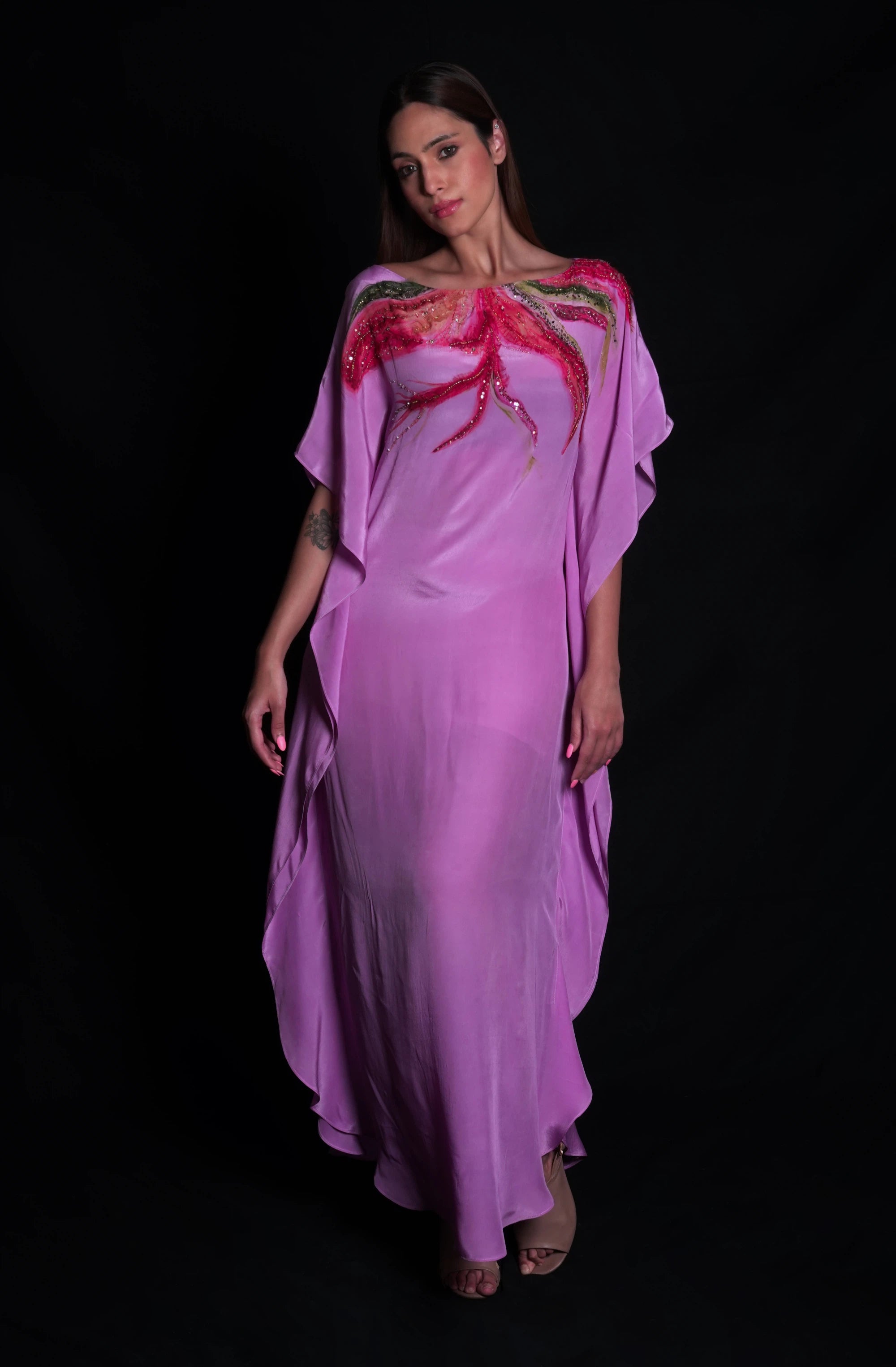 Meet the Purple Rose Embroidered Kaftan — where artisanal embroidery blooms against the canvas of Bemberg crepe. Light, fluid, and breathable, the fabric drapes beautifully, allowing the kaftan to become both statement and sanctuary.