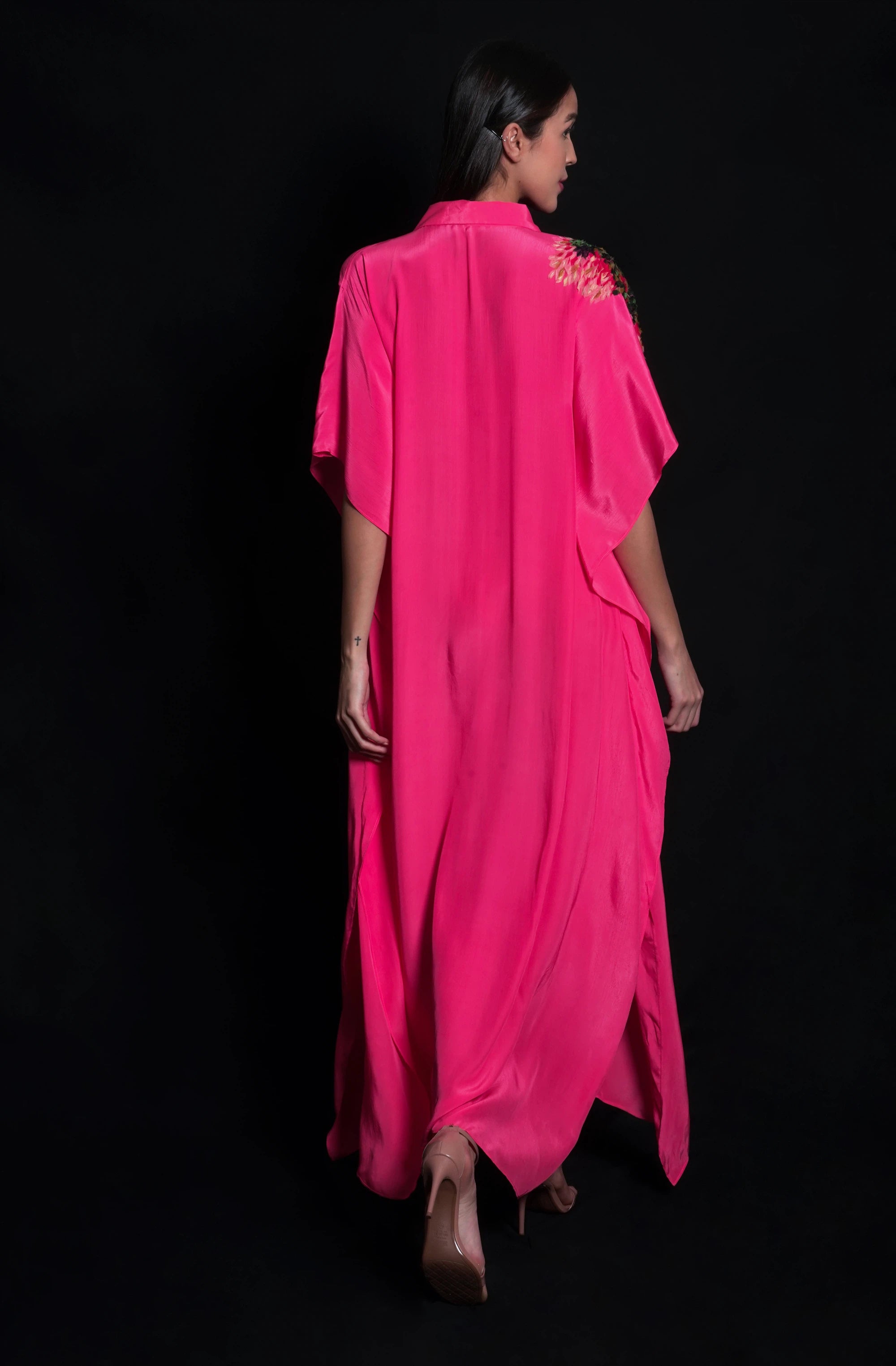 Half sleeves and a collared neckline frame the kaftan, while the front closure keeps it practical yet graceful. Its tea rose hue adds romance, making it a versatile choice for relaxed evenings or elegant daywear.