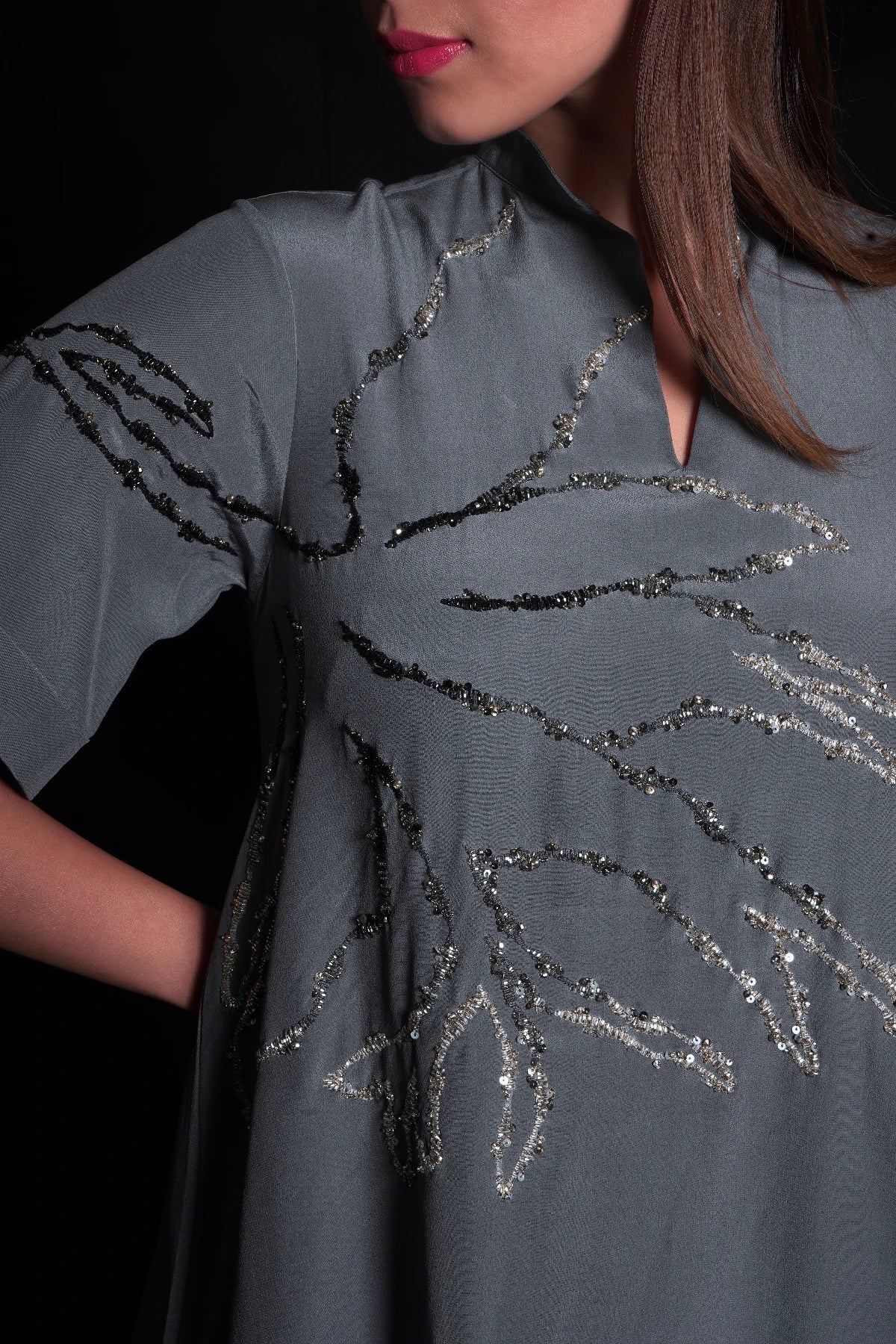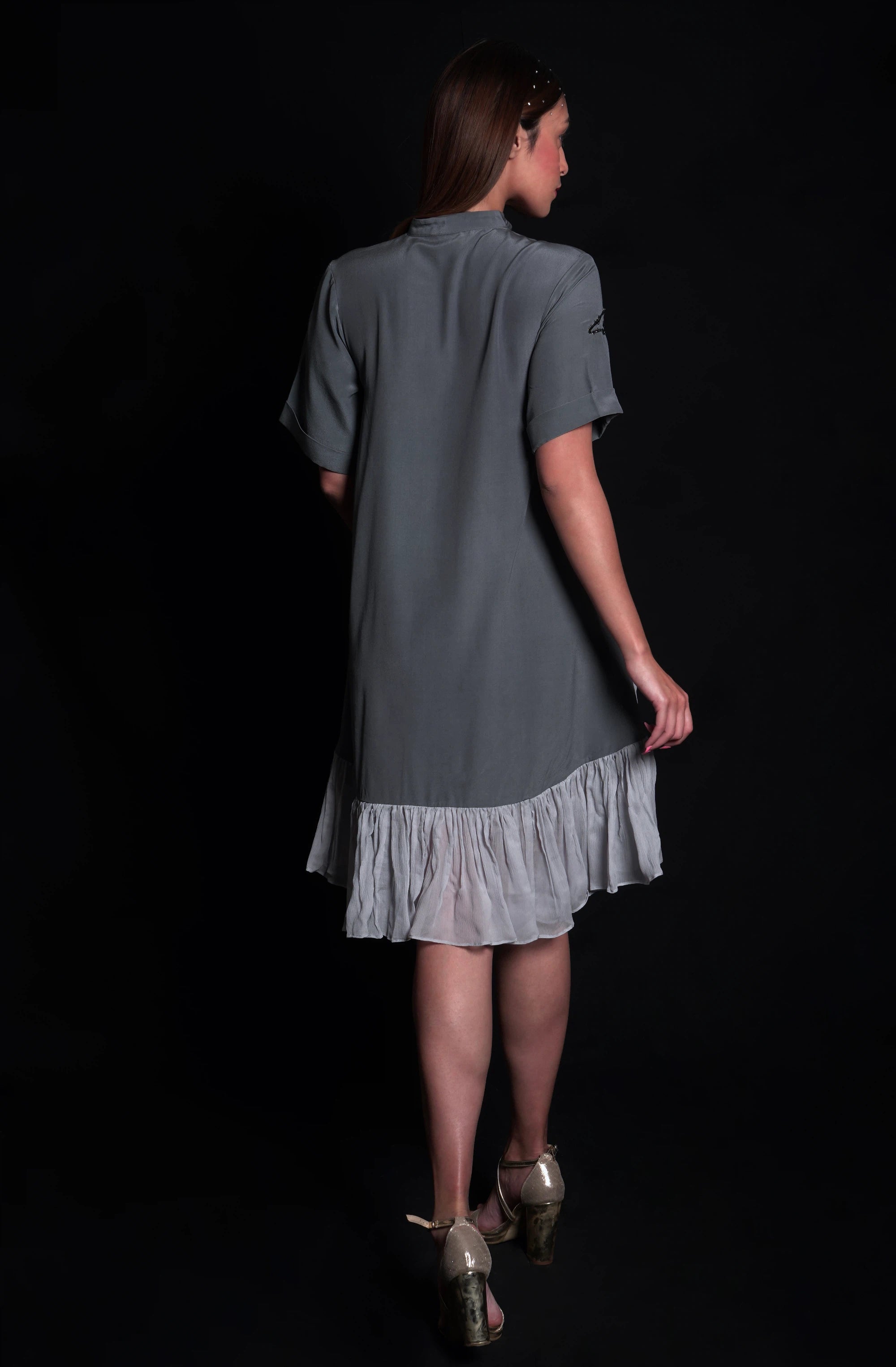 Its titanium hue anchors the playfulness of the silhouette, giving it a sophisticated edge. Effortless to wear with its slip-on style, this dress is made for those who carry grace with strength, balancing softness with quiet power.