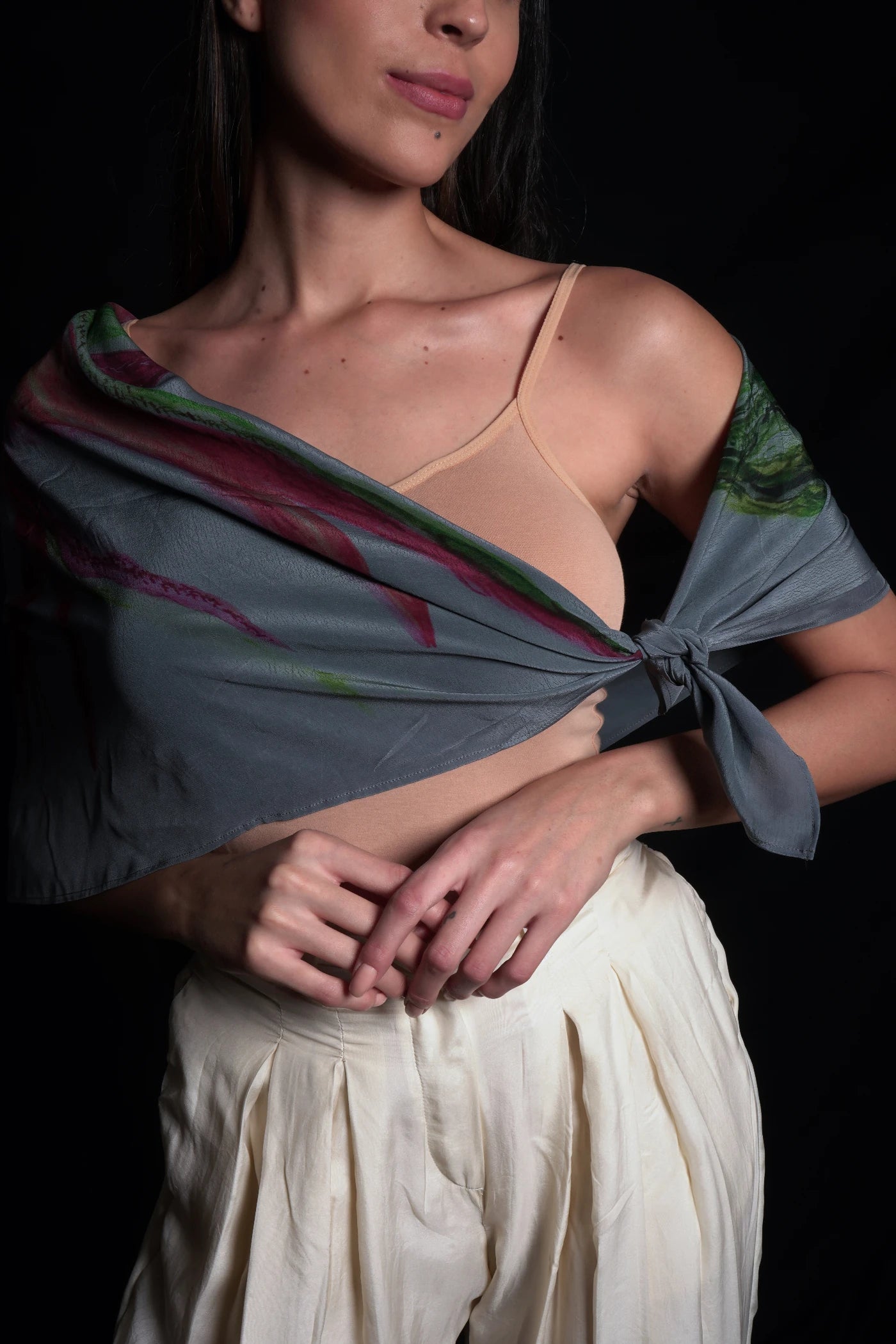 Discover the Titanium Scarf with Floral Print — a whisper of elegance in flat silk chiffon. Light as air, the scarf features a monotone broken flower print that lends depth while keeping the design subtle and sophisticated.
