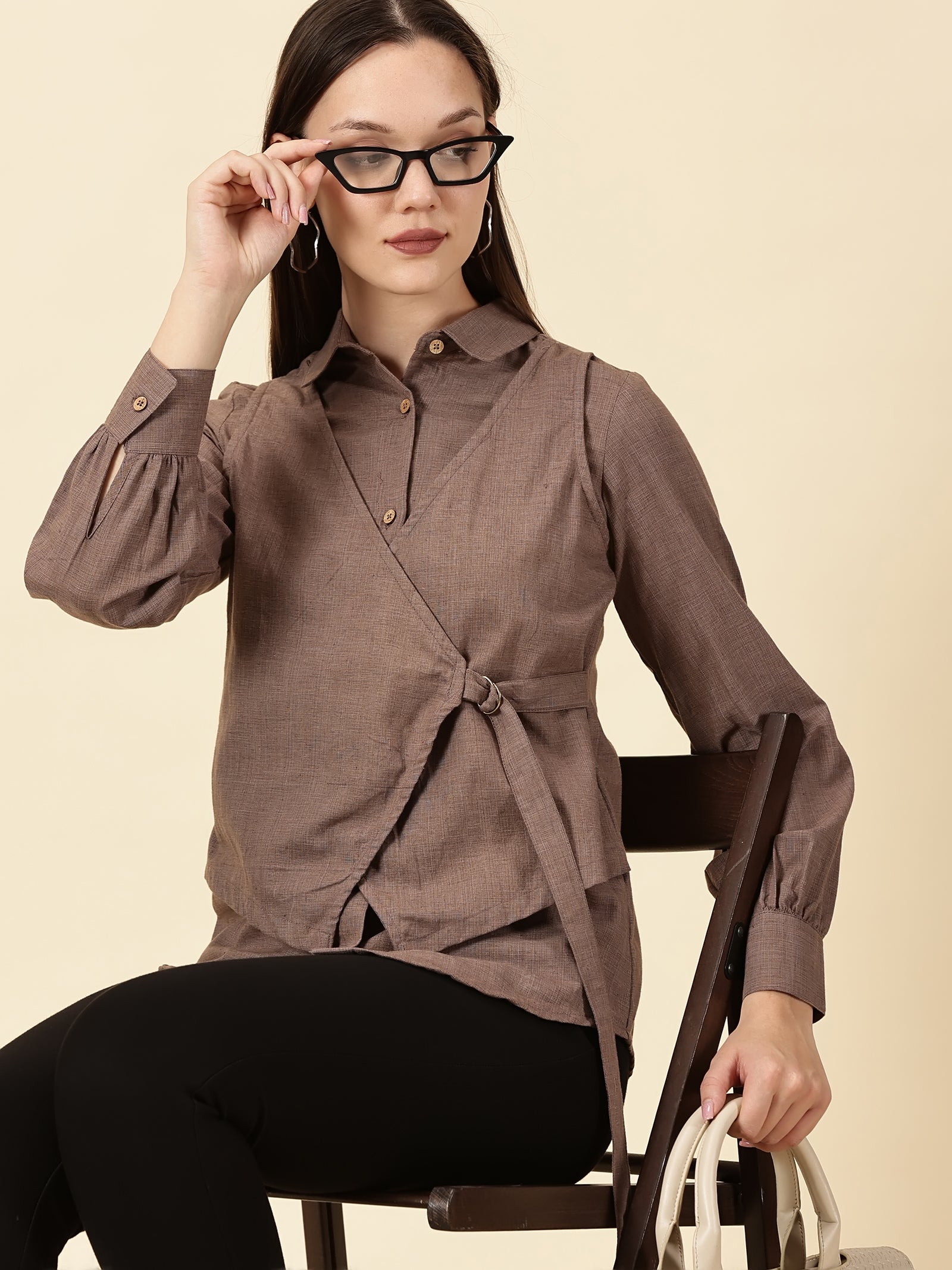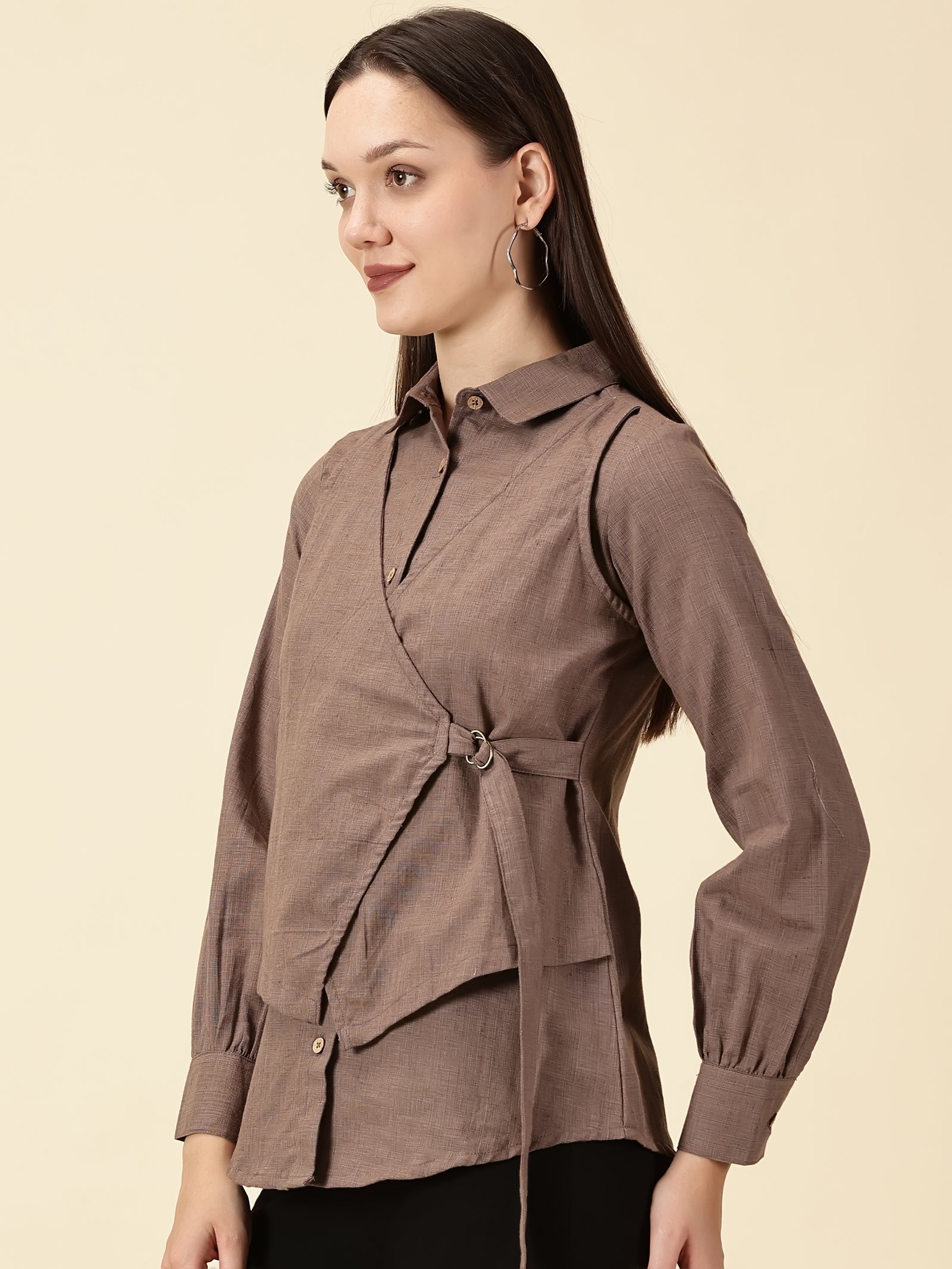 A timeless neutral with a modern silhouette, the Brown Wrap Shirt is crafted for women who love sleek, effortless workwear. The premium viscose rayon fabric gives a soft, breathable feel, while the wrap design adds structure without stiffness. Elegant, minimal, and endlessly versatile, pair it with trousers, skirts, or sarees.