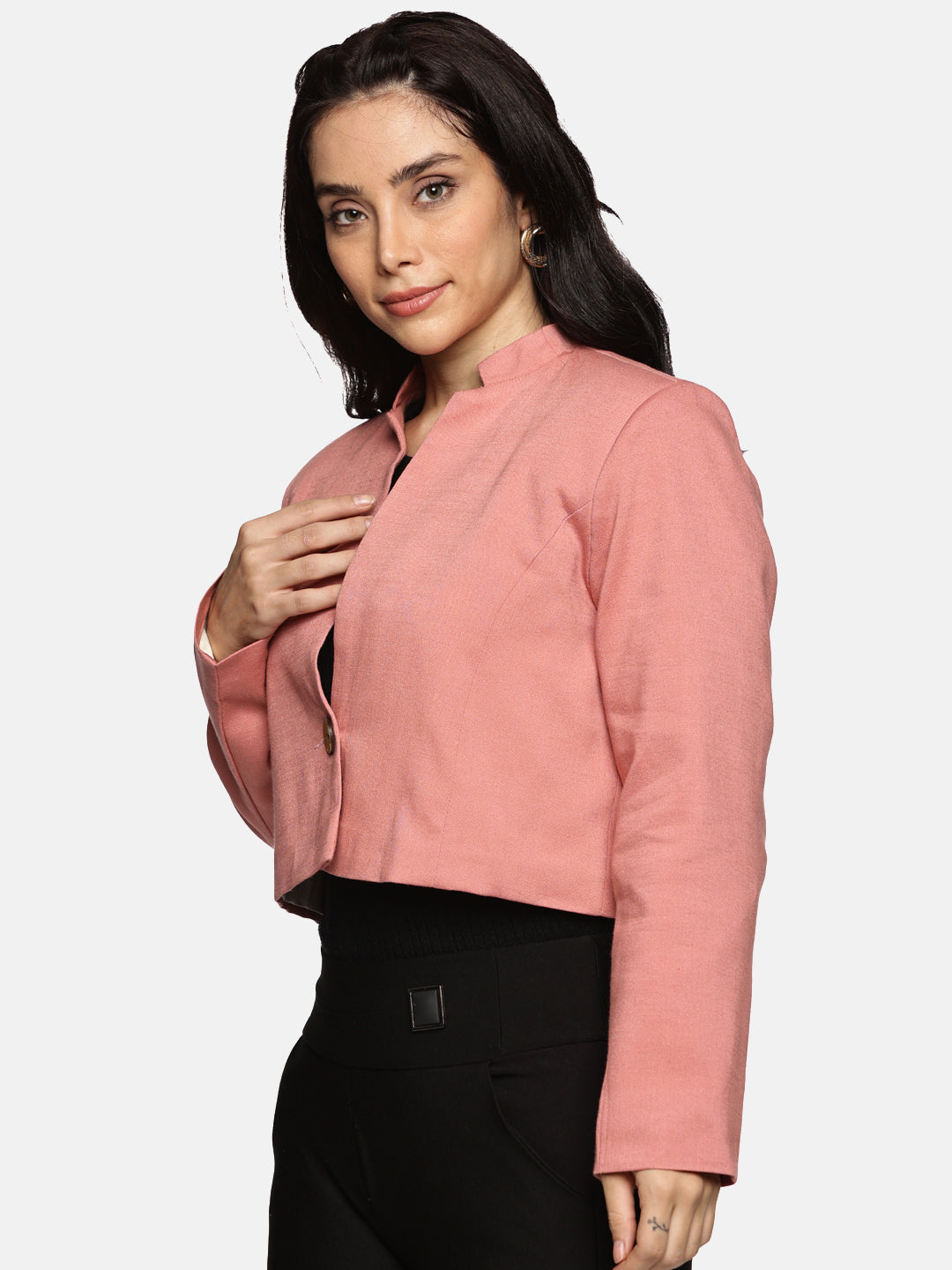 Soft, chic, and instantly flattering. This baby-pink crop blazer is designed to elevate your silhouette while keeping your look playful and modern. The cropped length adds length to your frame, and the cotton fabric keeps it breathable. Pair it with high-waisted trousers or skirts for a clean, elongated look. Perfect for dates, meetings, or weekend outings. A little blush. A lot of style.