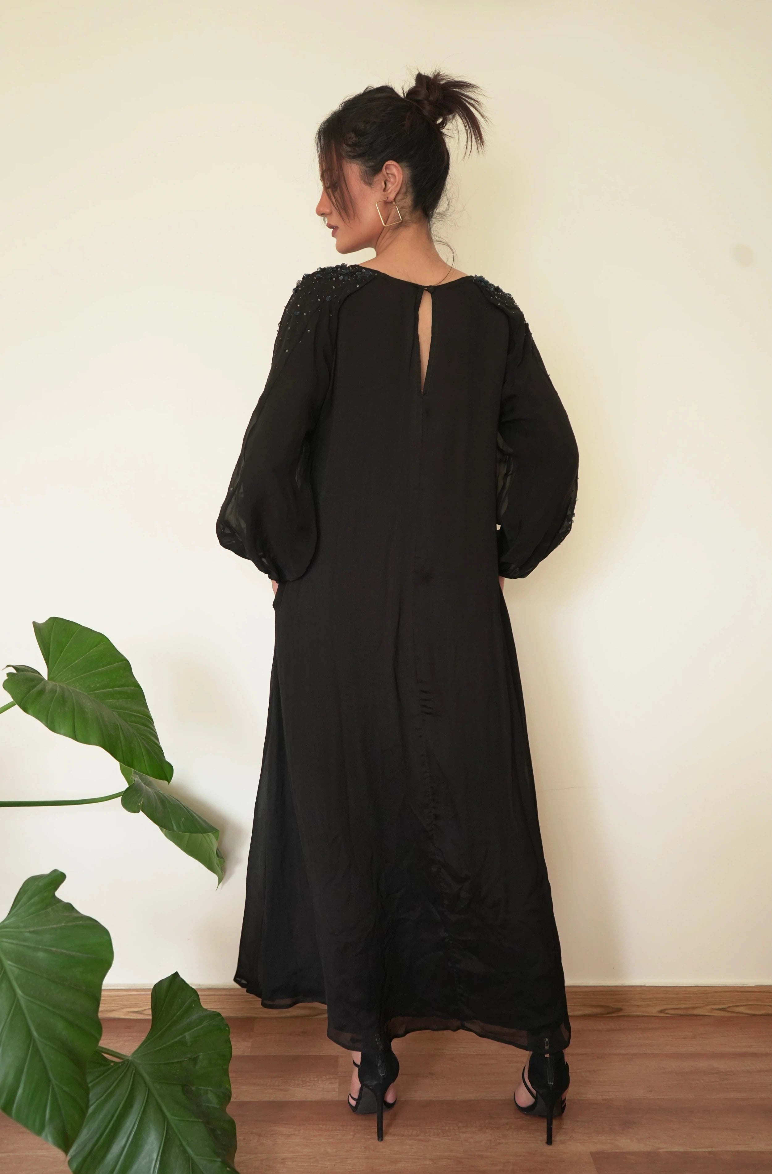 The Asteria Embroidered Dress in jet black is a graceful ode to quiet sophistication. Crafted in Chinnon chiffon organza with a soft, silky modal lining, this dress offers a fluid drape that feels as elegant as it looks.
